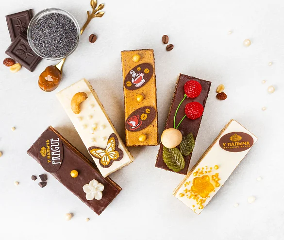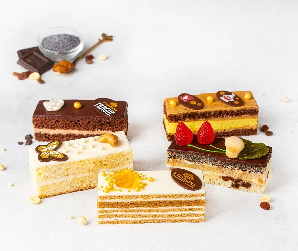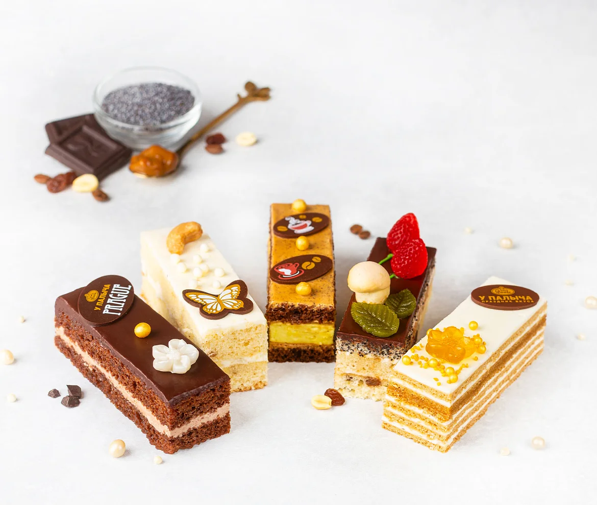 Для самых любопытных лакомок пять видов наших тортов в миниатюре: «Прага», «Ореховое», «Кофейное», «Медовое» и «Лесная поляна».