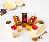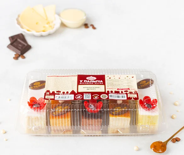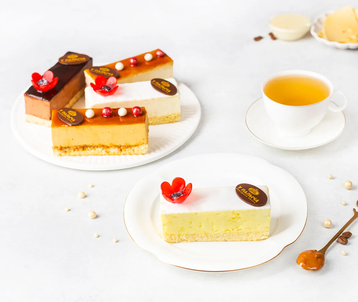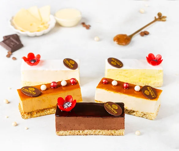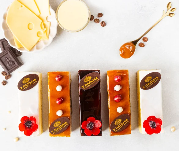 Пирожные повторяют 3 вида тортов "Птичка от Палыча" – классика, крем-брюле, шоколадное, торт "Сырный" и торт "Тирамису" в варианте суфле на агаре с добавлением "Тирамису" (сливки, кофе). Пирожные украшены по аналогии тортов.