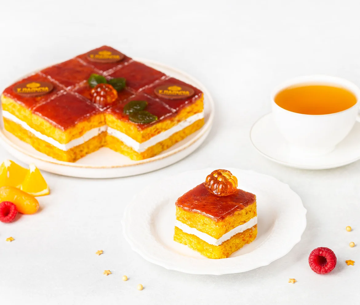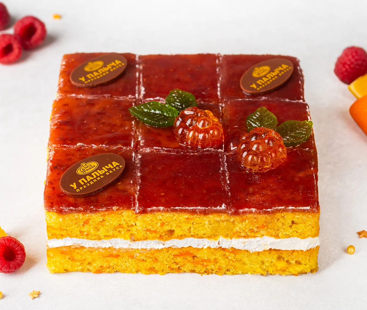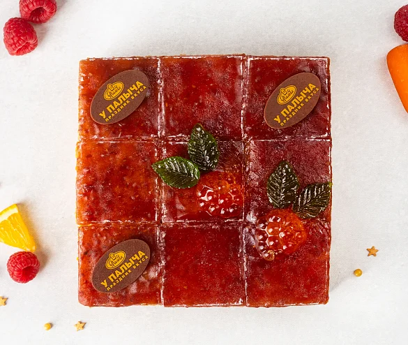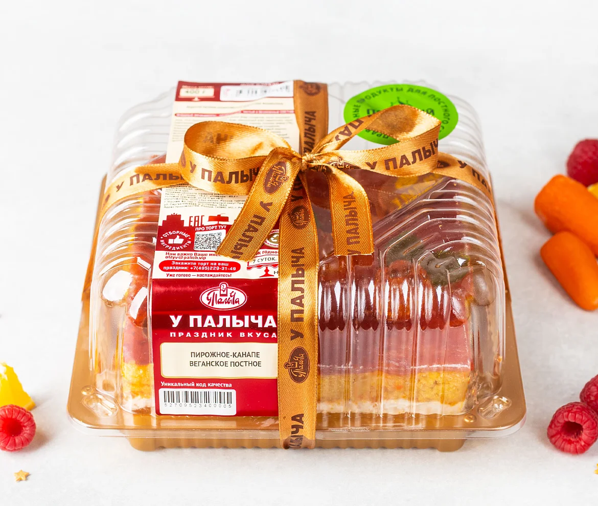 Ароматная лесная малина и терпкие свежие лимоны в сочетании с легким кремом на нежном апельсиново-морковном бисквите, с декором и фирменными медальками У Палыча из темного шоколада – этот шедевр для поклонников вкусной, полезной и красивой еды! Это изысканное пирожное не содержит компонентов животного происхождения – им в полной мере могут насладиться веганы. В пост можно не отказываться от сладкого – это очень легкое пирожное: коржи с морковью без молока и яиц, воздушный крем на основе растительных сливок и натуральная сладкая начинка из ароматных лимонов и малины. В составе только натуральные ингредиенты, никаких красителей, ароматизаторов и усилителей вкуса! Растительные ингредиенты, свежие фрукты и ягоды - все только самое свежее и отборное! Угощение представлено в виде порционных пирожных-канапе для удобной и модной подачи к праздничному столу. Удовольствия и изысканной красоты хватит на всех!