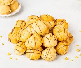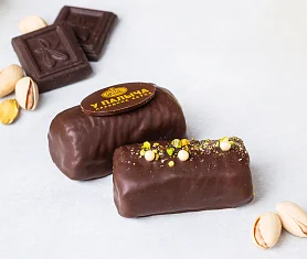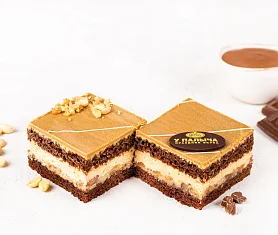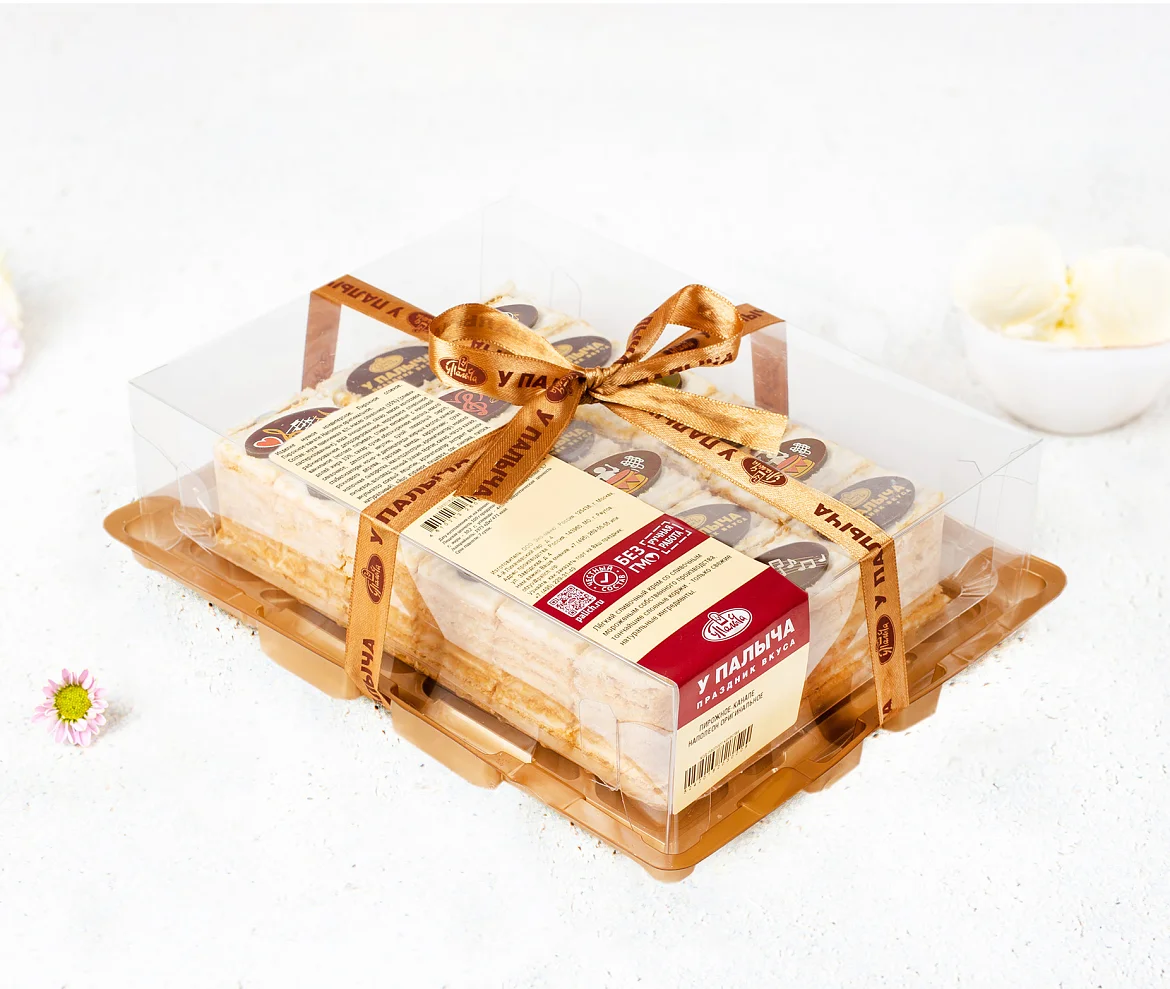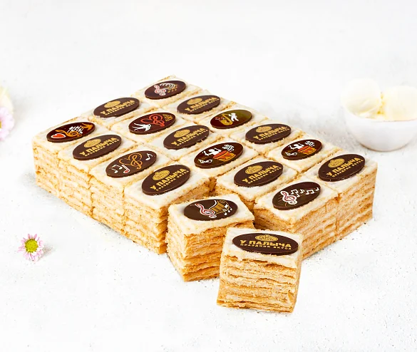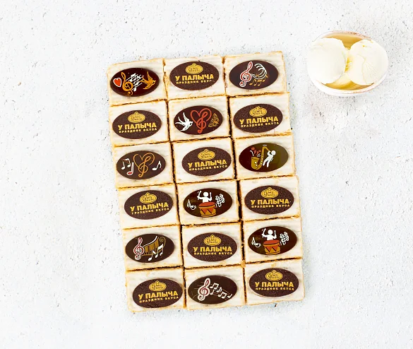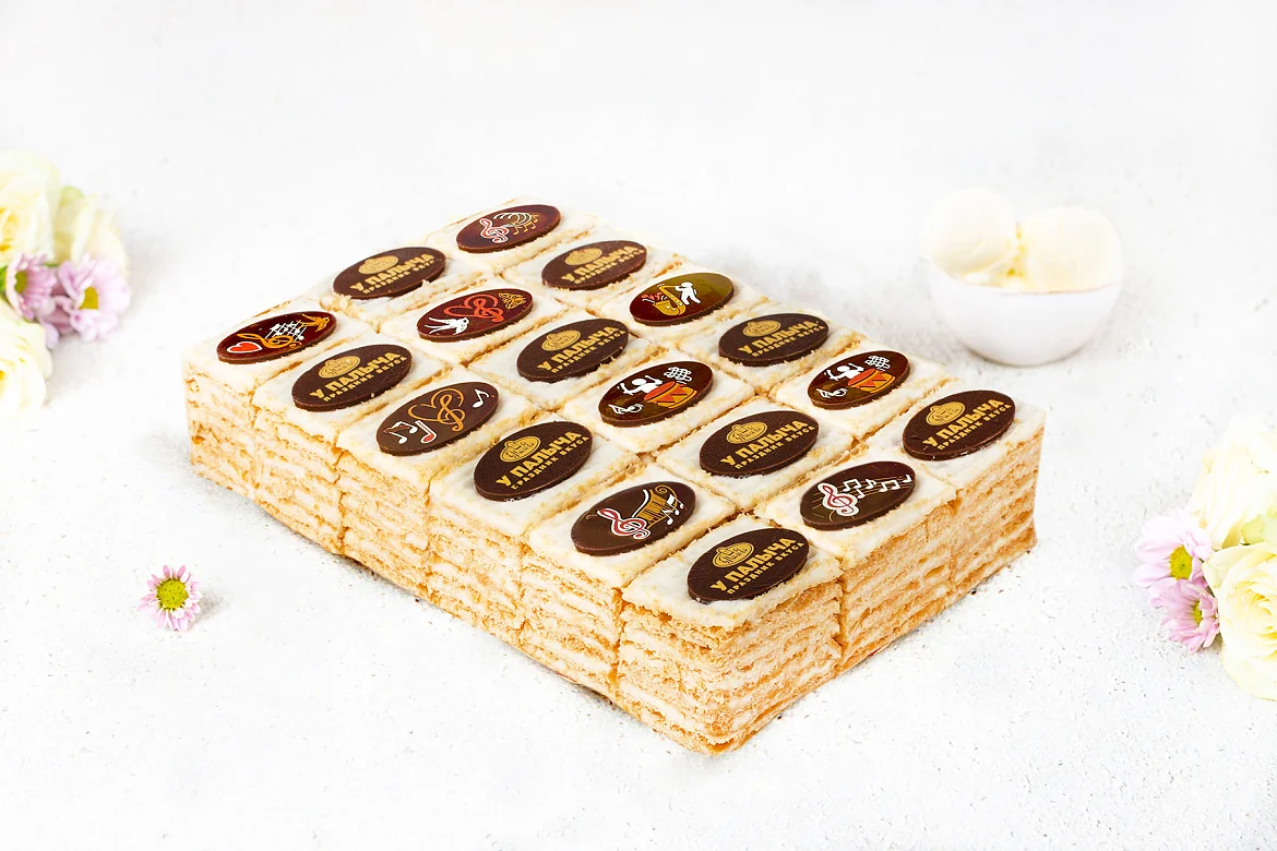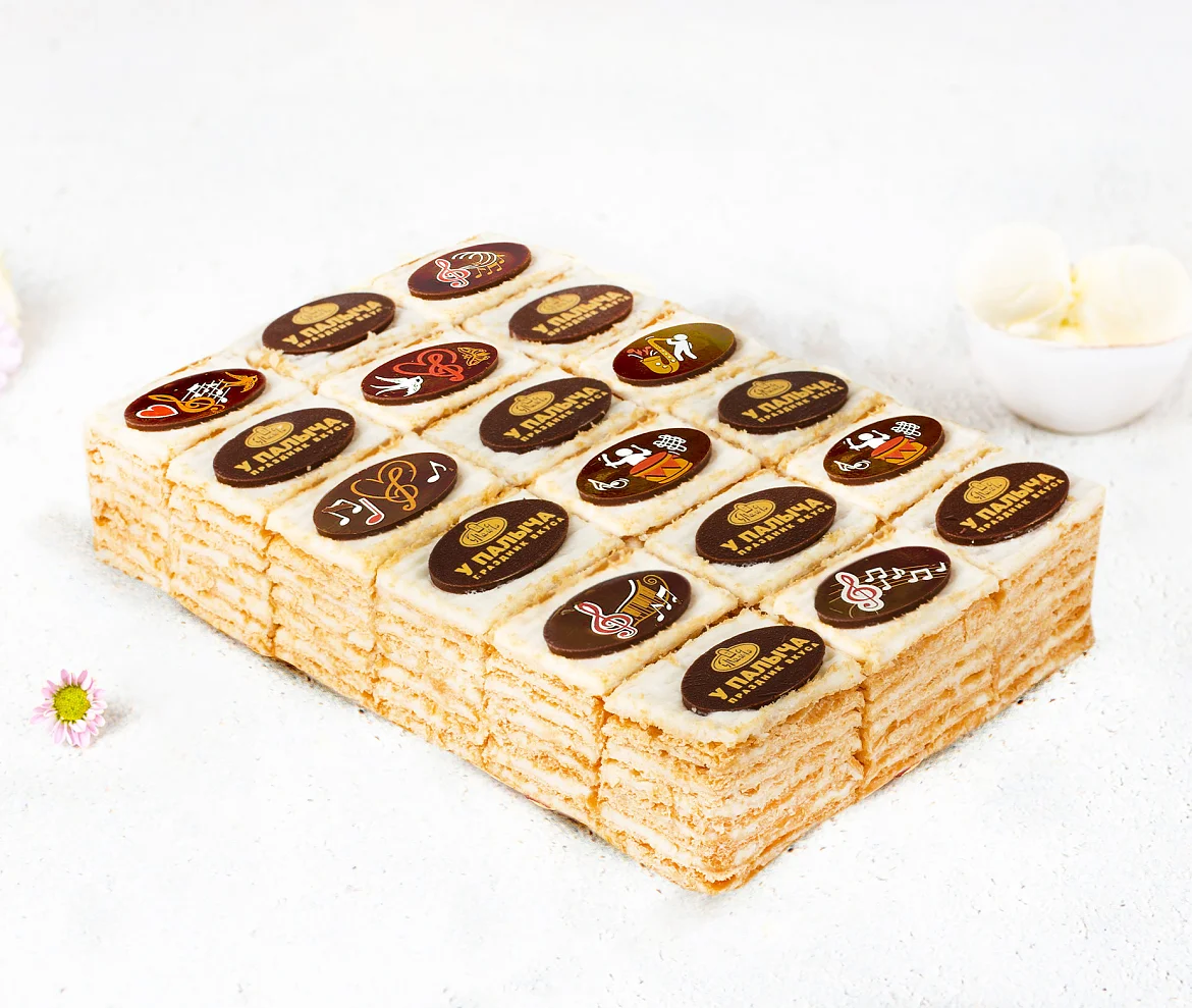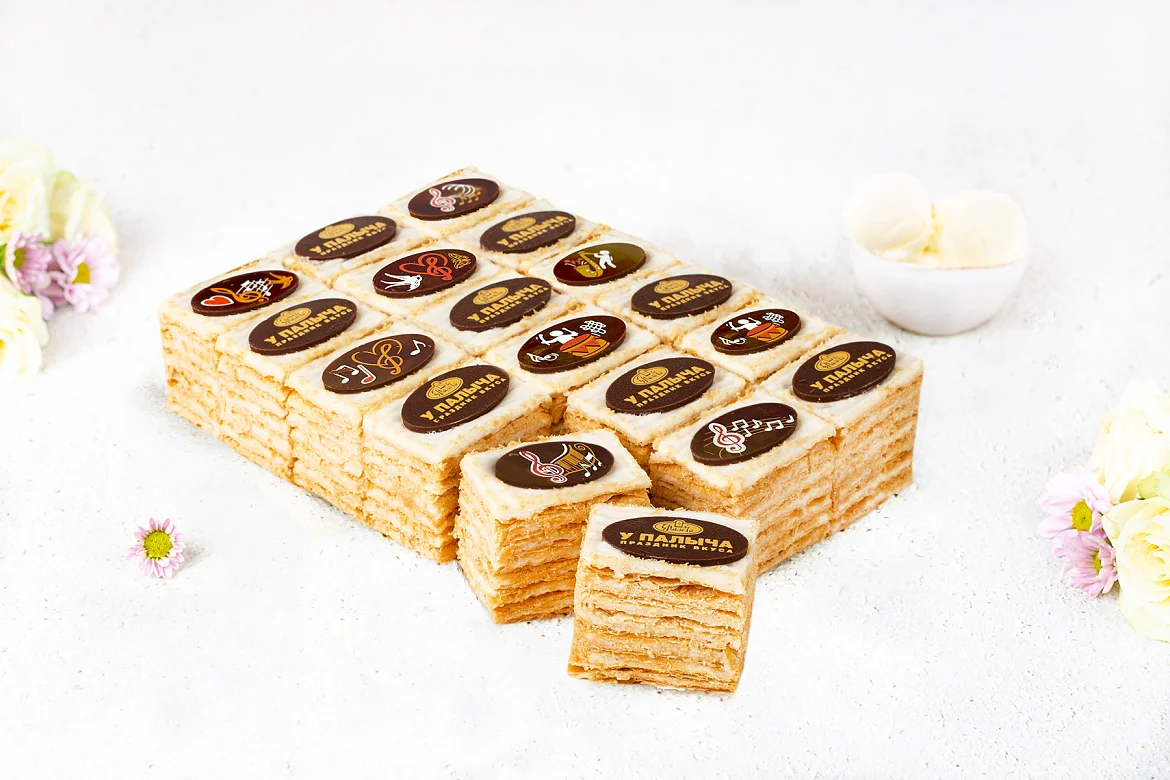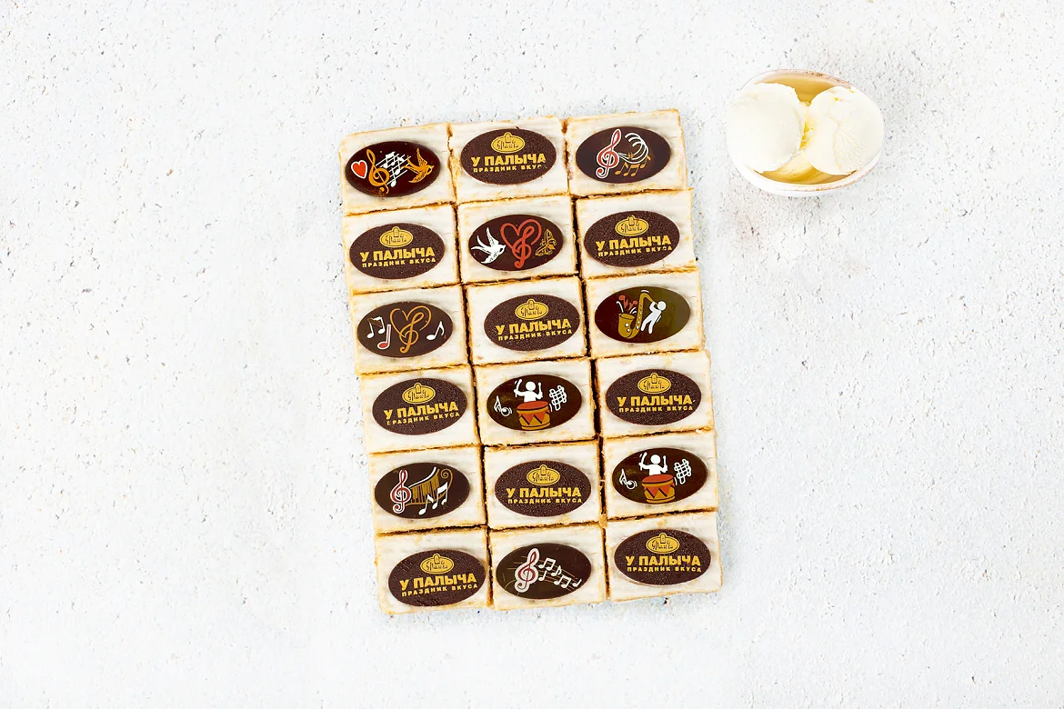 Сливочно-заварной крем со сливочным мороженым собственного изготовления, 9 тончайших слоеных коржей толщиной всего 1,5 мм, сделать их – целое искусство, которым владеют талантливые мастера-кондитеры ТМ У ПАЛЫЧА. Изысканное лакомство в стильной подаче – пирожные-канапе, украшенные медальками из горького шоколада собственного производства.