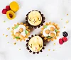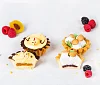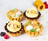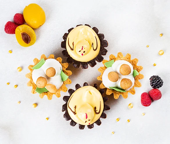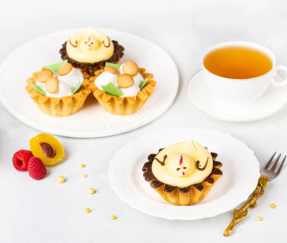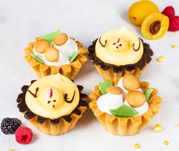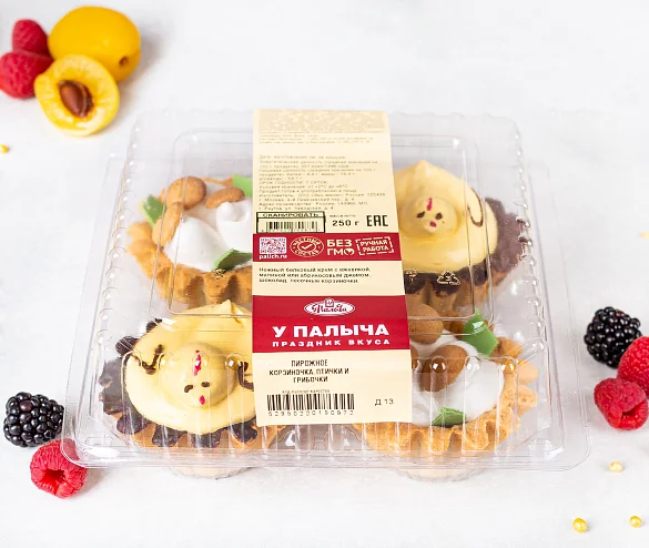 Набор пирожных: - два из которых, с отделкой «Птички», состоят из песочной хрустящей корзиночки, края которой украшены горьким шоколадом и заполнены абрикосовой начинкой. - два из которых, с отделкой «Грибочки» состоят из песочной хрустящей корзиночки и начинки «Лесная ягода», состоящей из лесной малины и ежевики. Белковый крем состоит из яичного белка , взбитого и заваренного горячим сахарным сиропом с агаром, с добавлением лимонной кислоты и ванили.