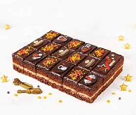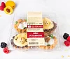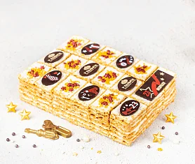 Мука пшеничная в/с, сахар, маргарин (рафинированные дезодорированные масла в натуральном и модифицированном виде (пальмовое масло и его фракции, подсолнечное масло), вода), яйцо куриное пищевое, джем абрикосовый (8%) (сахар, вода, абрикосы сушеные (курага), регулятор кислотности лимонная кислота, стабилизатор пектины), вода очищенная, малина с/м, шоколад темный (какао тёртое, сахар, масло какао, эмульгатор соевый лецитин, ароматизатор экстракт ванили натуральный), шоколад белый (сахар, масло какао, молоко цельное сухое, сыворотка молочная сухая, эмульгатор соевый лецитин, ароматизатор экстракт ванили натуральный), масло сливочное (сливки пастеризованные), масло подсолнечное рафинированное дезодорированное, крахмал кукурузный, молоко цельное сгущенное с сахаром (молоко нормализованное, сахар (сахароза, лактоза)), загустители: агар, геллановая камедь, ксантановая камедь; красители натуральные: экстракт лютеина, кармины, медные комплексы хлорофиллов, бета-каротин; регулятор кислотности лимонная кислота, молоко питьевое, какао-порошок, ароматизаторы, крахмал картофельный, соль, крахмал пшеничный, ежевика с/м, патока, консервант сорбиновая кислота, разрыхлитель сода пищевая (гидрокарбонат натрия). Произведено на предприятии, на котором также выпускаются продукты, содержащие орехи, арахис, кунжут.