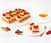 Сахар, яйцо куриное пищевое, масло сливочное (15%) (сливки пастеризованные), малина с/м (15%), молоко питьевое, мука пшеничная в/с, вода очищенная, шоколад темный (какао тёртое, сахар, масло какао, эмульгатор соевый лецитин, ароматизатор экстракт ванили натуральный), масло кокосовое рафинированное дезодорированное, крахмал картофельный, желирующие агенты: желатин, агар; сок лимона, соль, красители натуральные: кармины, бета-каротин; разрыхлитель сода пищевая (гидрокарбонат натрия), глюкоза ферментированная, ароматизатор экстракт ванили натуральный.