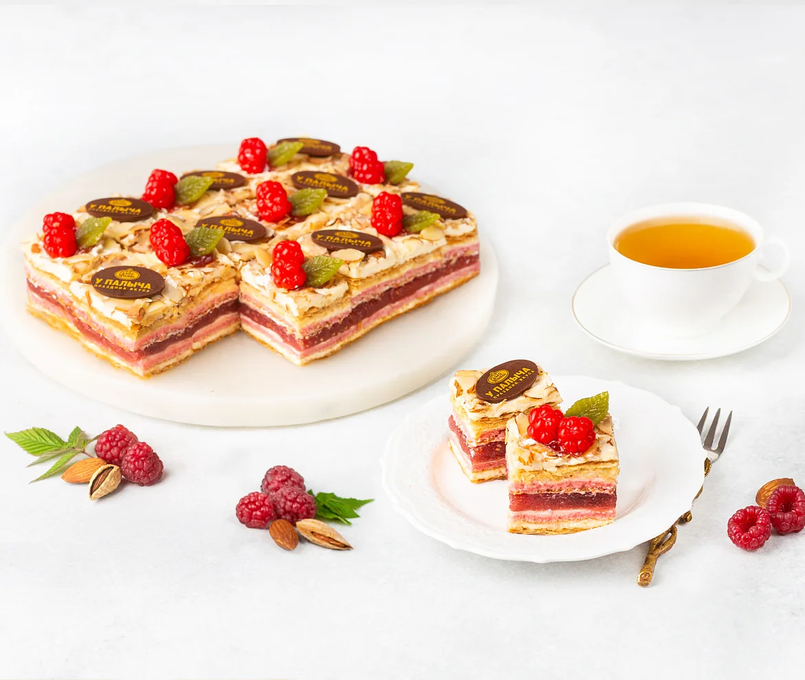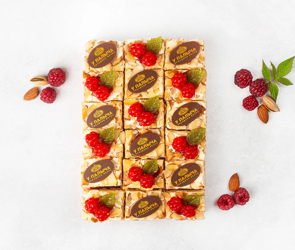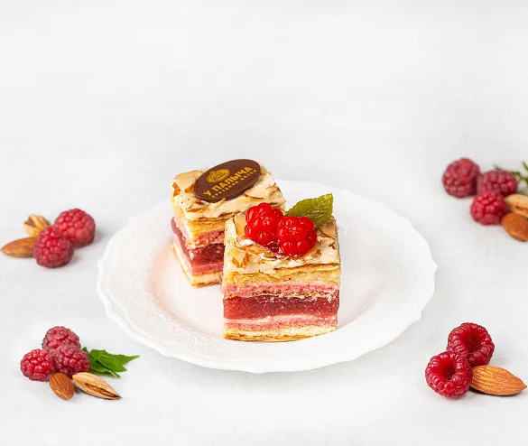 Лесная малина, воздушный бисквит и слоеные коржи с нежным сливочно-заварным кремом с добавлением итальянской меренги – превосходный десерт от наших кондитеров. Изысканное лакомство в стильной подаче –пирожные-канапе, украшенные медальками из темного шоколада собственного производства.