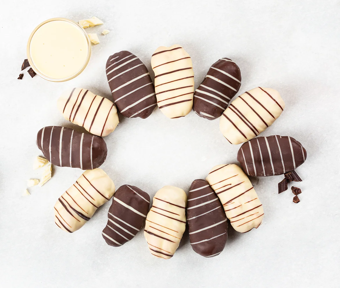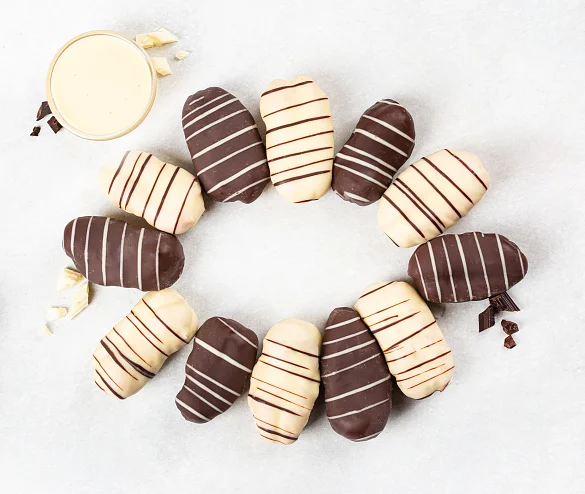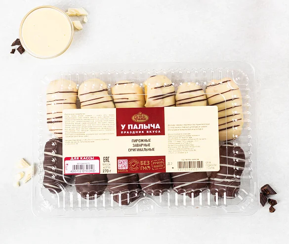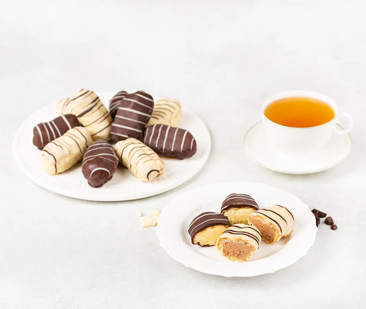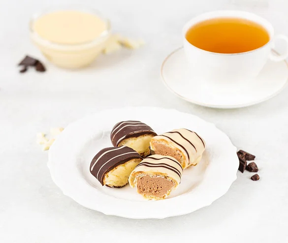 Нежные заварные пирожные со сливочным и шоколадно-сливочным кремом. Пирожные со сливочным кремом покрываются горьким шоколадом, а с шоколадно-сливочным кремом – белым шоколадом.