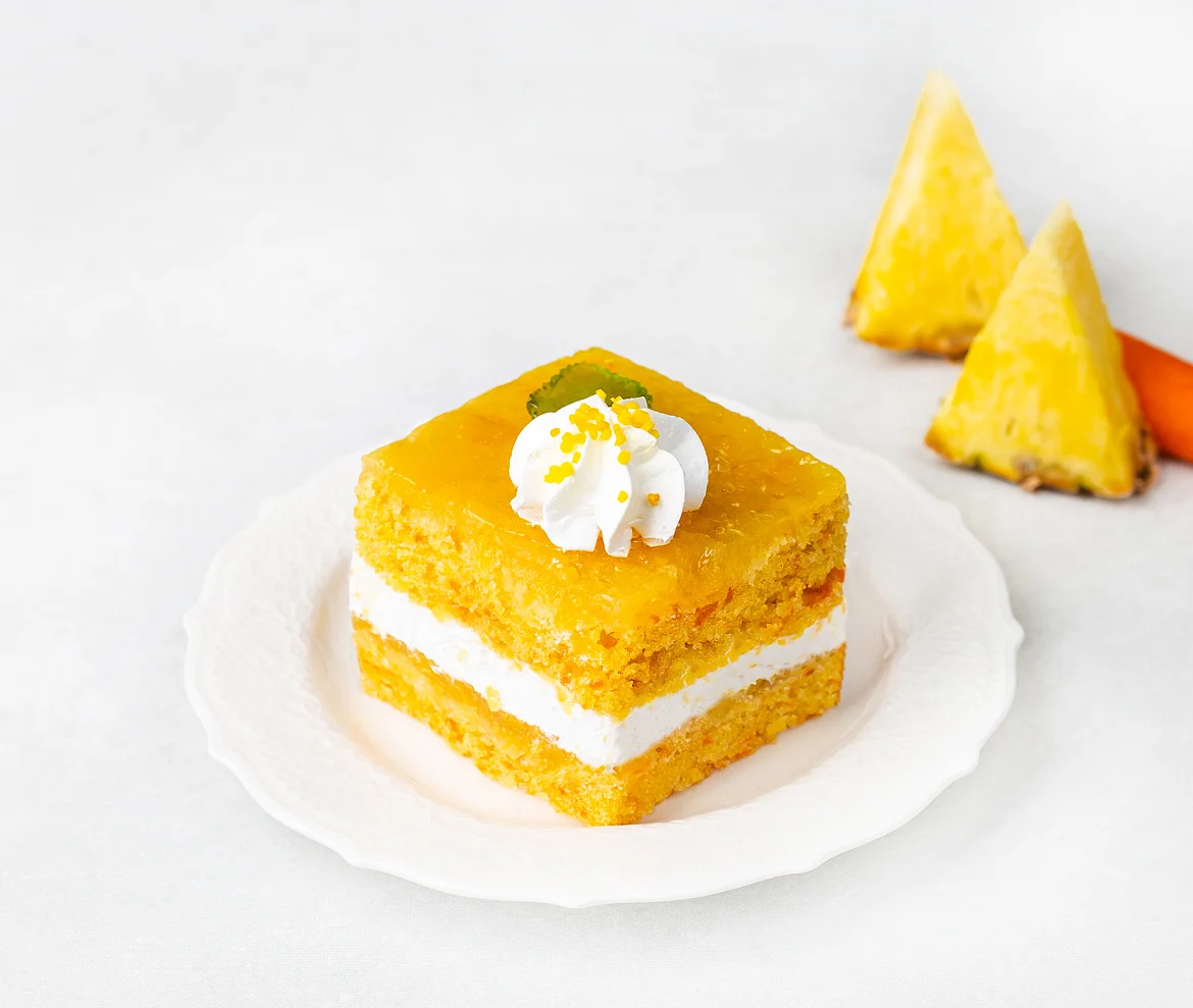 Постные пирожные из нежного морковного бисквита, прослоенного кремом на основе растительных сливок с добавлением спелого ананаса. Порадуйте себя и своих близких вкусным полезным лакомством.