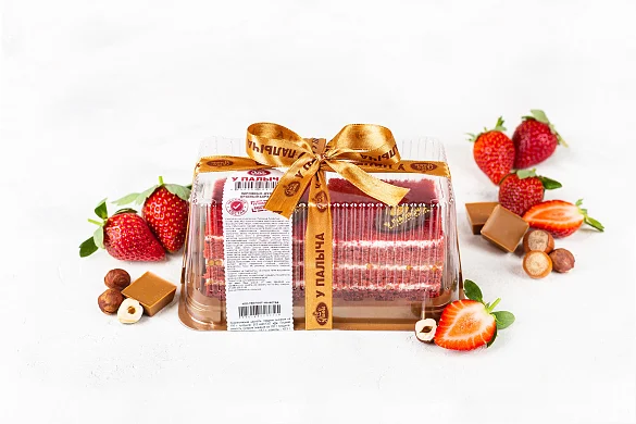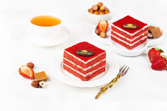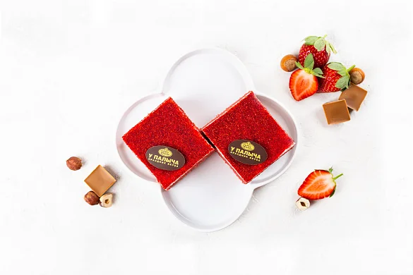 Воздушный бисквит яркого красного цвета в сочетании с белоснежным кремом из настоящего творожно-сливочного сыра собственного изготовления. Карамельно-шоколадный грильяж с отборным фундуком, уникальным карамельным шоколадом и клубничным ароматом для изысканности вкуса и яркости ощущений.