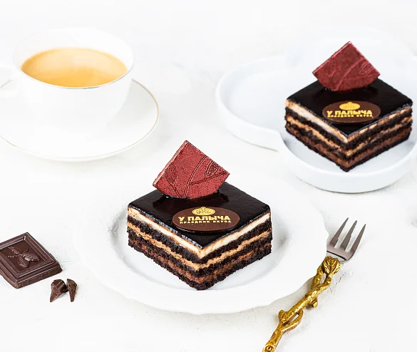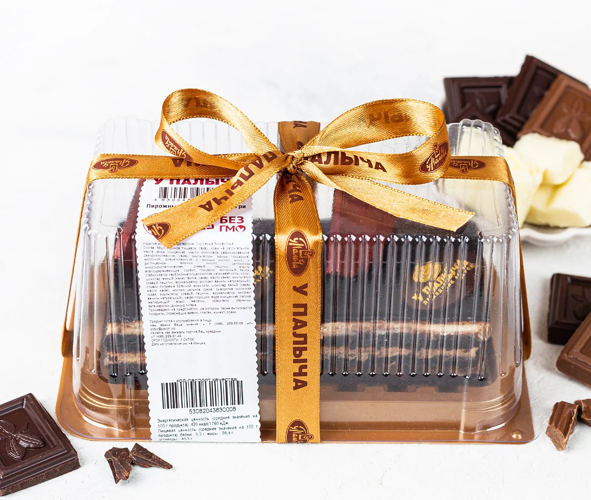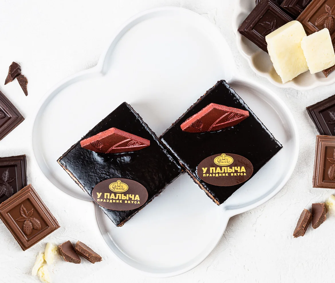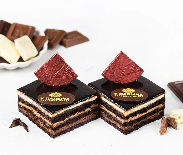 Уникальные пирожные без пшеничной муки. Превосходное сочетание трёх видов мусса из белого, молочного и тёмного шоколада с нежным шоколадным бисквитом на основе какао.