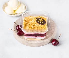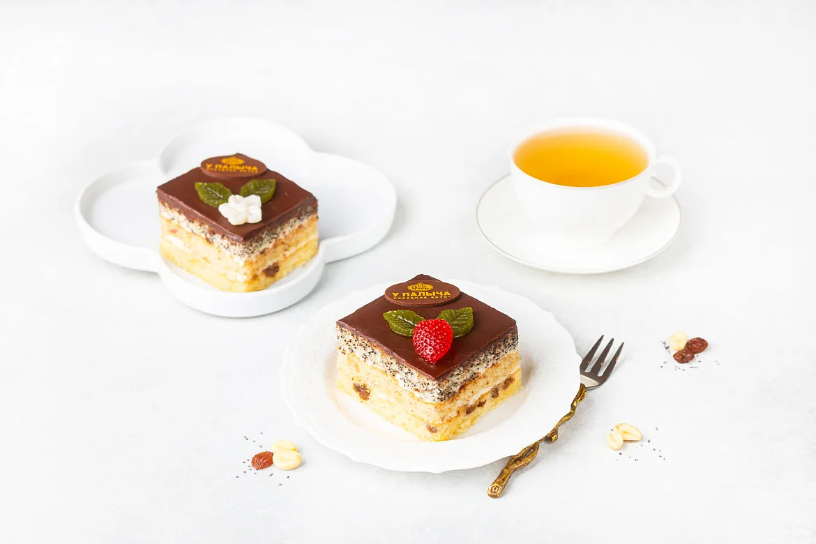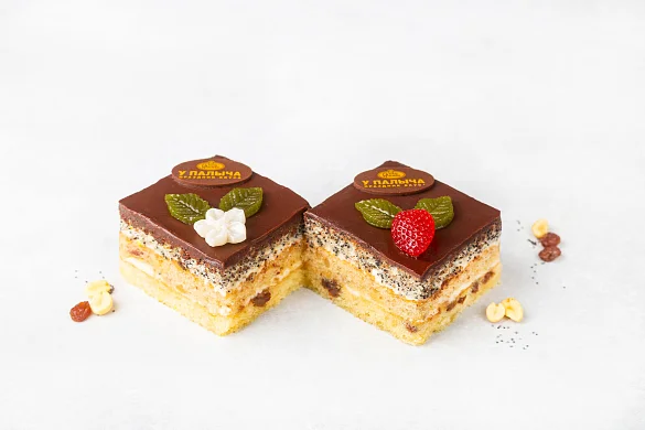 Мини-версия знаменитого торта: три вида бисквита – с маком, с арахисом и изюмом. Бисквит пропитан сахарным сиропом с добавлением ликера, каждый слой промазан сливочным кремом.