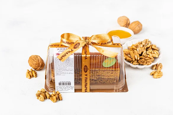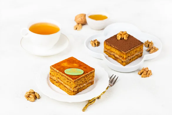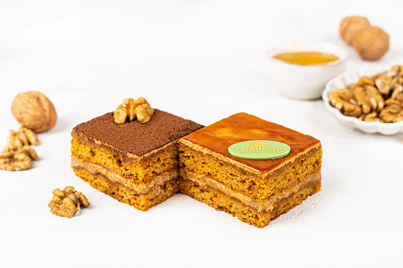 Великолепная легенда! Классика! Роскошное сочетание ароматного медового бисквита, нежного сливочно-заварного крема на основе вареного сгущенного молока и прослойки из грецкого ореха в молочной карамели. Грандиозный вкус!