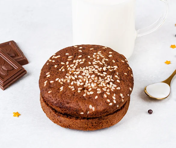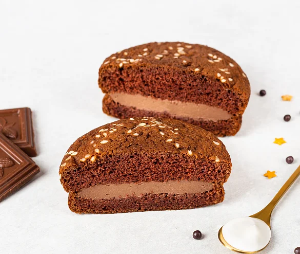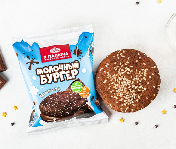 Уникальное пирожное в форме бургера от Палыча. Шоколадные "булочки" из воздушного бисквита с кунжутом и нежная шоколадная начинка с настоящим темным шоколадом без заменителей какао-продуктов от шоколатье У Палыча. Выраженный шоколадный вкус и много пользы от молока!