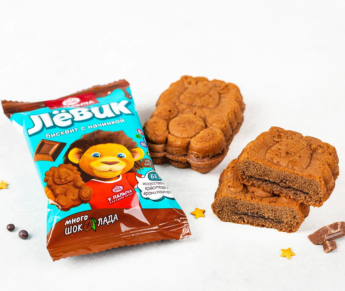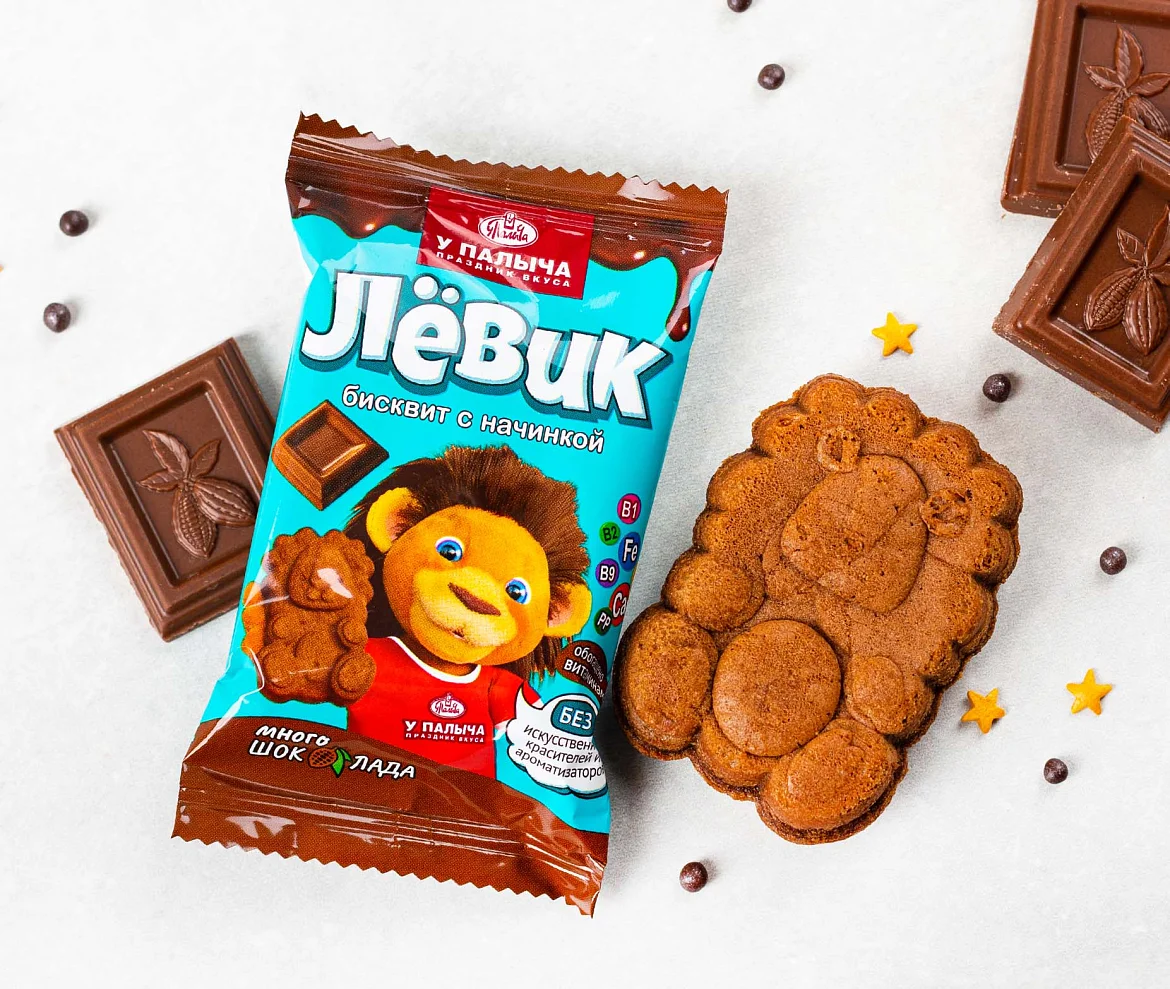 Воздушный шоколадный бисквит с премиальным эквадорским какао и много супершоколадной начинки. Чистый состав без искусственных ароматизаторов и красителей. Мягкий бисквитик в форме милого львенка очень вкусный, он гарантированно понравится как детям, так и взрослым. А еще принесет пользу, ведь "Левик" обогащен полезными витаминами и минеральными веществами. Идеальный размер, приятная индивидуальная упаковка — такое лакомство удобно брать с собой куда угодно.