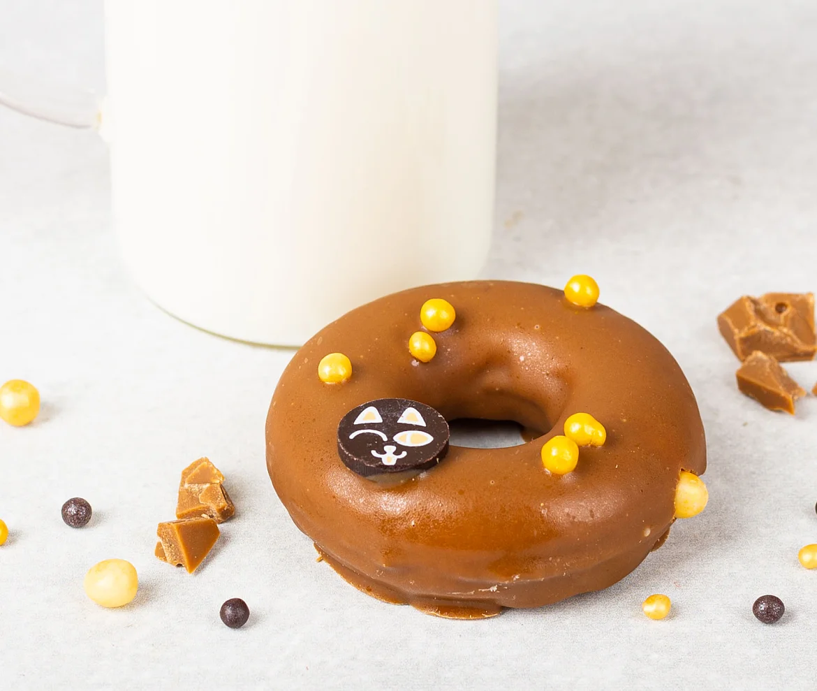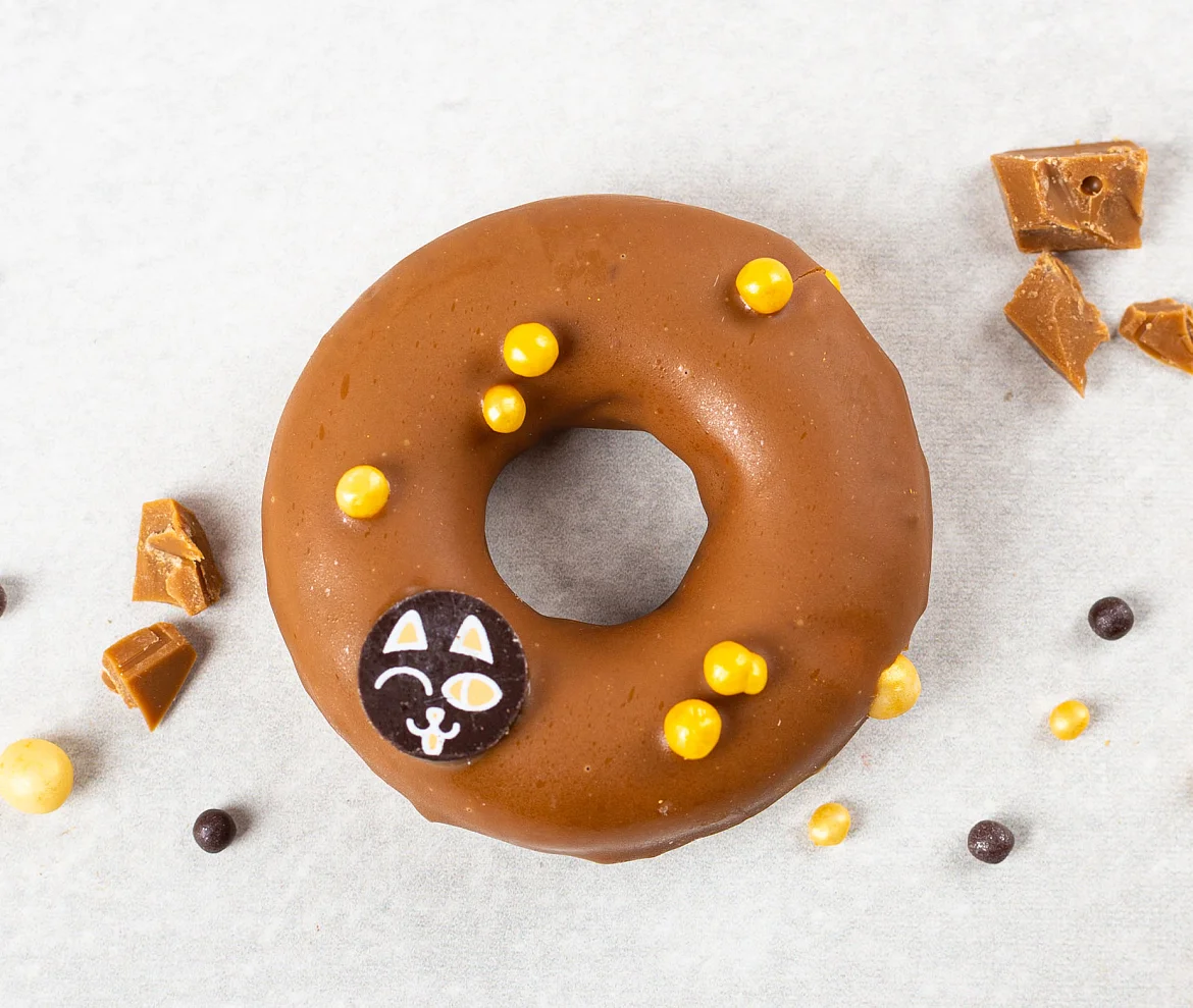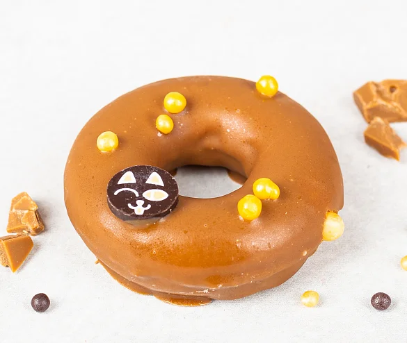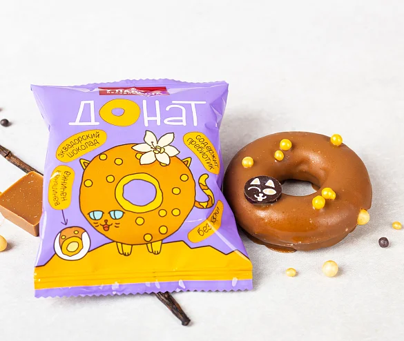 Уникальный бисквитный донат с шоколадной мордочкой котика. Он, как пончик, только лучше. Его не жарят, а пекут - поэтому в нем меньше жира. В составе есть пребиотик - он приносит не только удовольствие, но и пользу. А еще вкуснейший карамельный шоколад из лучших какао-продуктов сверху и ароматная ванильная начинка с настоящей бурбонской ванилью внутри. А мордочки у котиков разные! Найди своего котика!