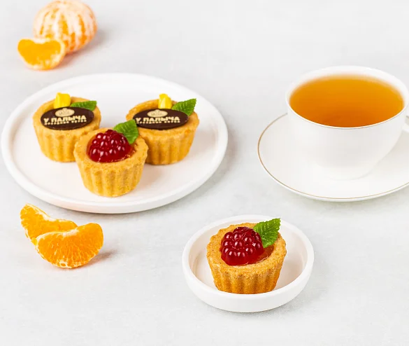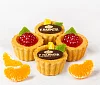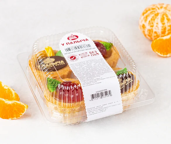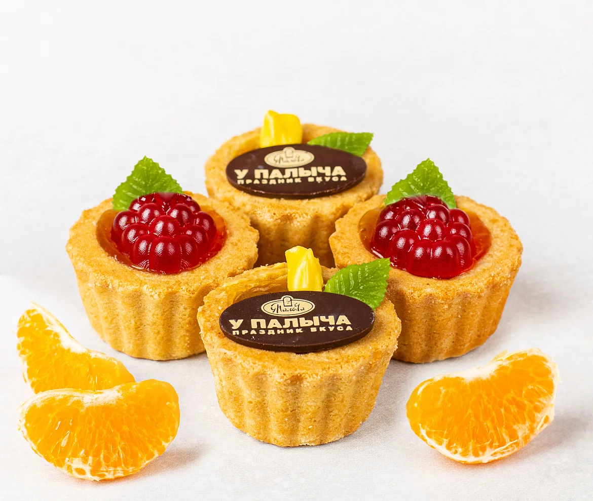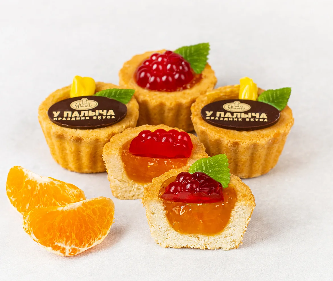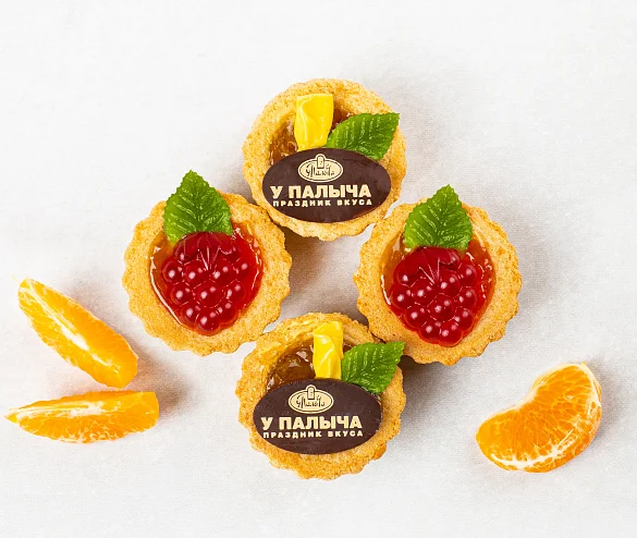 Рассыпчатые корзиночки из нежного песочного теста с ароматной сочной начинкой из спелых фруктов и ягод. Декор из натурального фруктового мармелада, вкуснейшего сливочного крема и элитного темного шоколада из отборных какао-продуктов. Идеальный десерт с ярким фруктовым вкусом.
