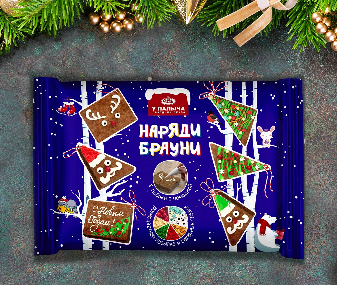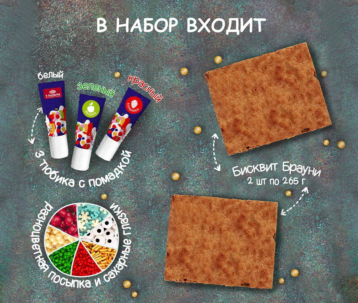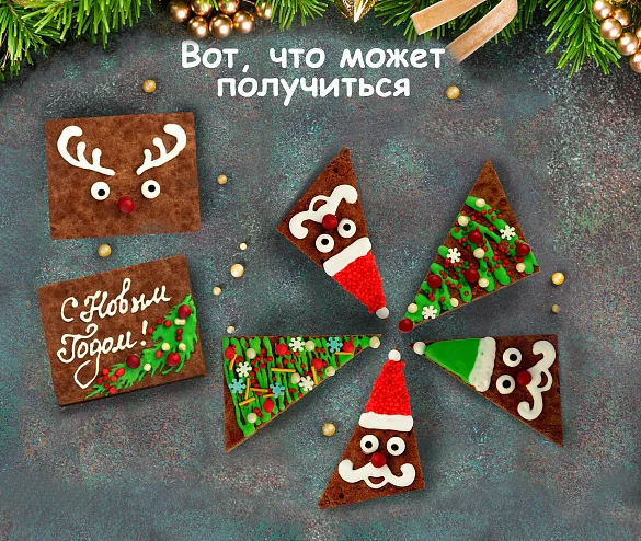Отправьтесь в путешествие в новогоднюю сказку — нарядите шоколадные брауни цветными помадками и посыпками по-волшебному празднично! Праздничный набор для веселого досуга с детьми. В наборе вкуснейший шоколадный брауни и все, что нужно для украшения: сладкие помадки и разноцветные посыпки. Немного фантазии - и у Вас вкусные и красивые пирожные разных форм к празднику!