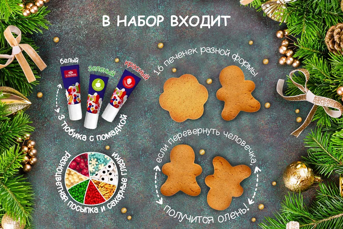 Отправьтесь в путешествие в новогоднюю сказку — нарядите вкусные печеньки цветными помадками и посыпками по-волшебному празднично! Праздничный набор для веселого досуга с детьми. В наборе веселые печеньки разных форм и все, что нужно для украшения: сладкие помадки и разноцветные посыпки. Немного фантазии - и у Вас вкусное и красивое печенье к празднику!