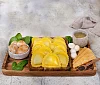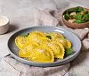 Мука из твердых сортов пшеницы в/с, филе грудки и мясо окорочка цыплят-бройлеров б/к, вода очищенная, сыр Моцарелла для равиоли (творог, вода очищенная, масло сливочное, молочный белок, сухое обезжиренное молоко, регуляторы кислотности: цитрат натрия, лимонная кислота; соль), мука пшеничная в/с, яйцо куриное пищевое, шпинат с/м, масло подсолнечное рафинированное дезодорированное, сыр Пармезан (молоко нормализованное пастеризованное, соль (содержит агент антислеживающий ферроцианид калия), уплотнитель хлорид кальция, молокосвертывающий ферментный препарат животного происхождения, ферментный препарат животного происхождения липаза, консервант нитрат натрия, ферментный препарат лизоцим (белок куриных яиц), бактериальная закваска молочнокислых мезофильных и термофильных микроорганизмов, краситель аннато (содержит регулятор кислотности гидроксид натрия)), творог 9%-ной жирности (молоко нормализованное, закваска), соль, краситель натуральный бета-каротин, морковь столовая свежая, лук репчатый свежий, перец черный молотый. Произведено на предприятии, на котором также выпускаются продукты, содержащие арахис, горчицу, кунжут, моллюски, орехи, рыбу, сельдерей, сою.