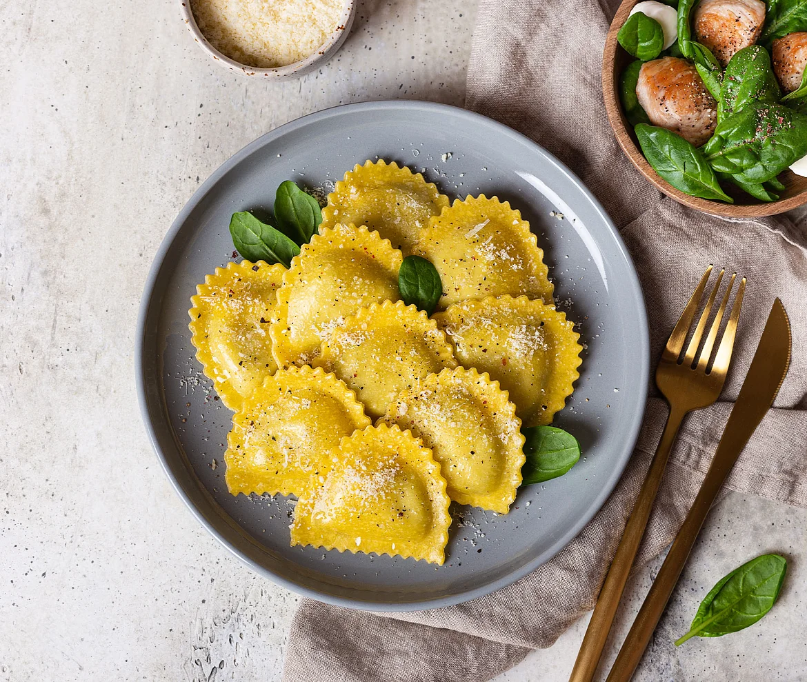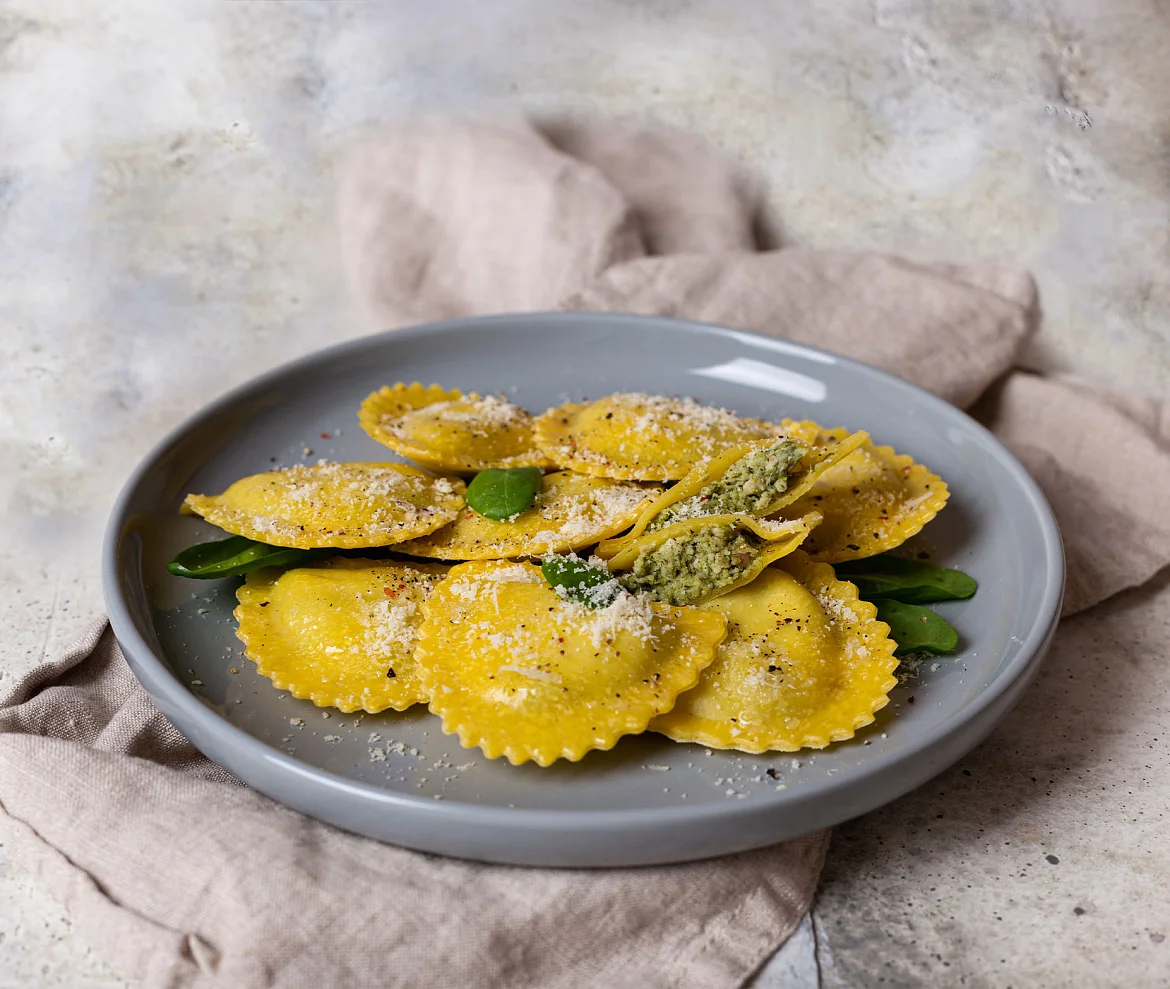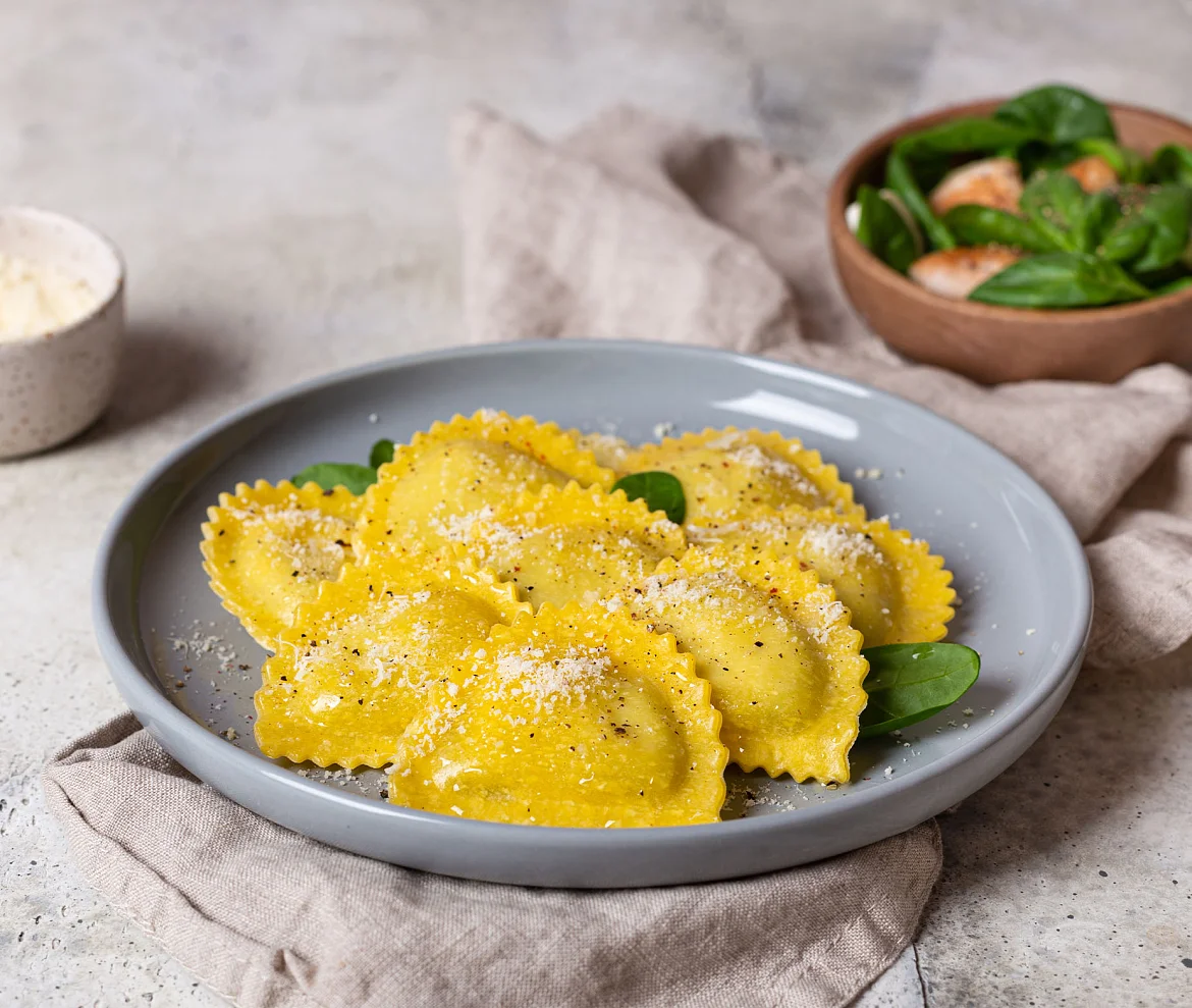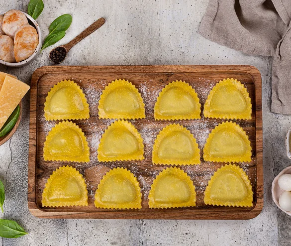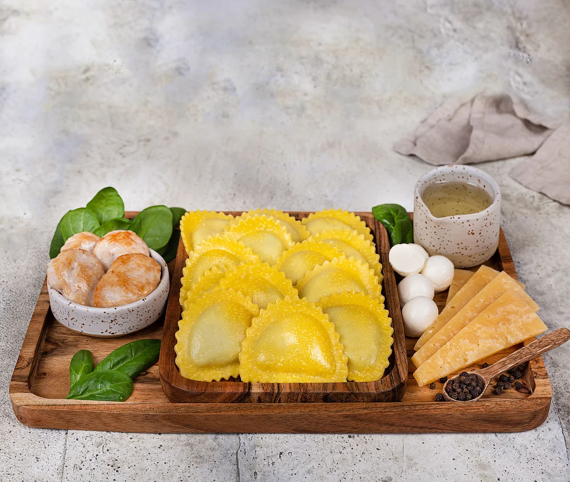 Вкуснейшая свежая паста премиум-качества. Тесто с мукой из твердых сортов пшеницы, привезенной специально из Италии. В тесте только цельные свежие яйца, без порошков. 50% начинки из отборного филе цыпленка, цельнолистового шпината и настоящего сыра без ЗМЖ - нежного рассольного и ароматного Пармезана. Готовятся всего 2 минуты - так сохраняются сложные углеводы твердых сортов пшеницы. Полезные медленные углеводы дают ощущение сытости надолго. В упаковке две порции. Идеально с соусом для пасты!