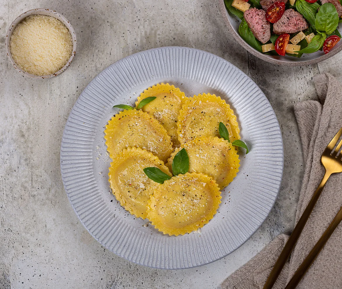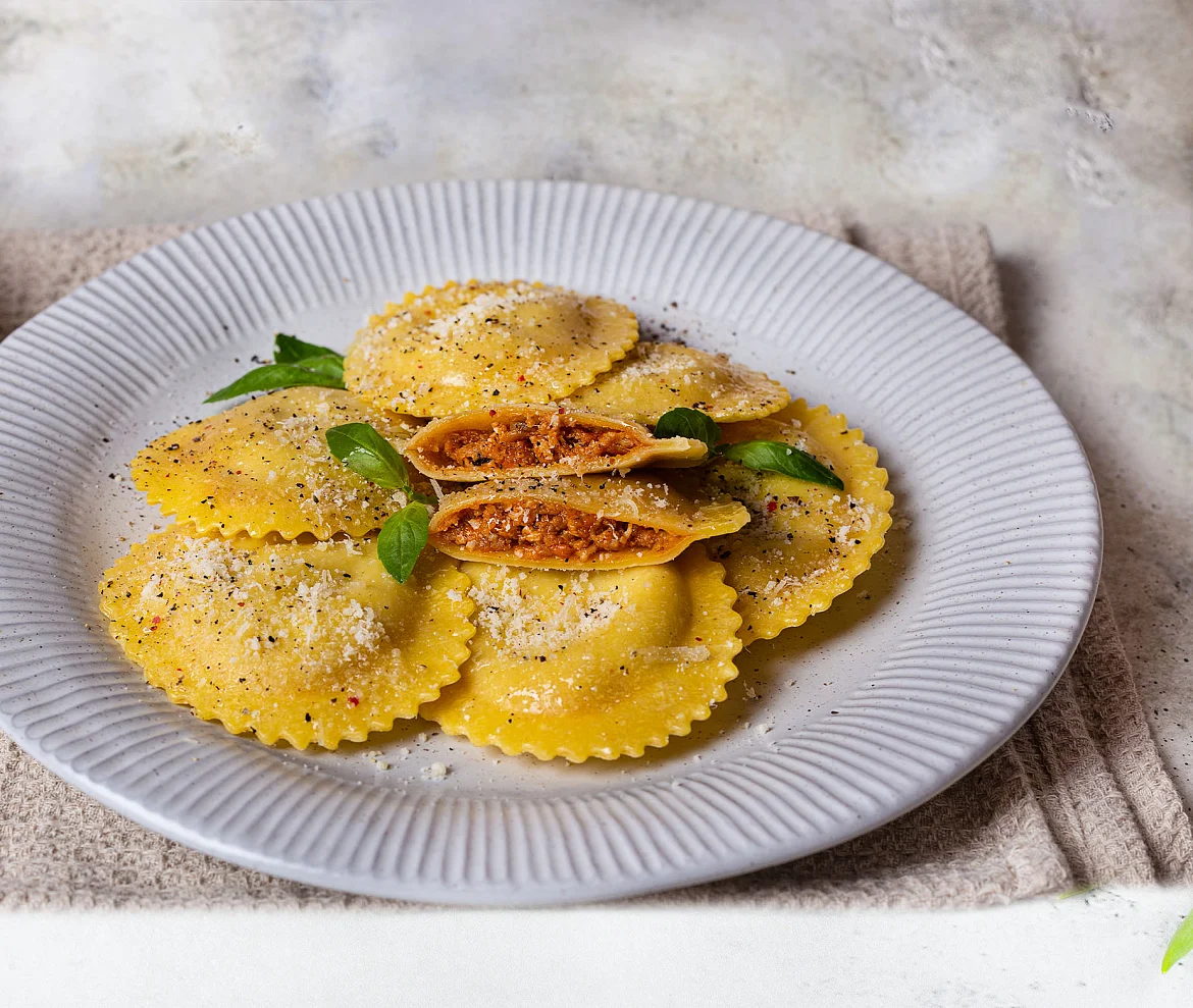Вкуснейшая свежая паста премиум-качества. Тесто с мукой из твердых сортов пшеницы, привезенной специально из Италии. В тесте только цельные свежие яйца, без порошков. 50% начинки из филе отборных свинины и говядины со спелыми томатами и настоящим сыром без ЗМЖ - молодым рассольным и ароматным Пармезаном. Готовятся всего 2 минуты - так сохраняются сложные углеводы твердых сортов пшеницы. Полезные медленные углеводы дают ощущение сытости надолго. В упаковке две порции. Идеально с соусом для пасты!