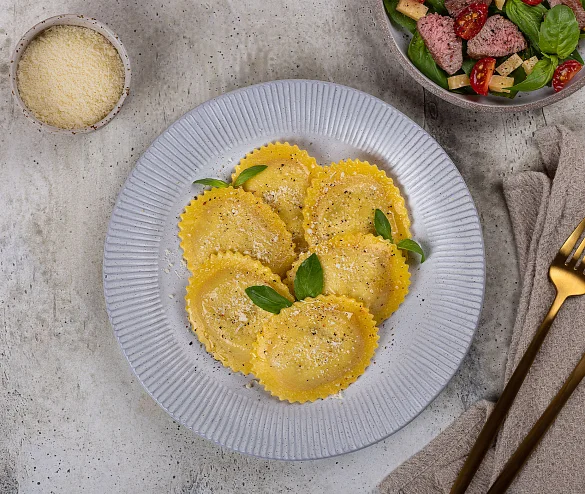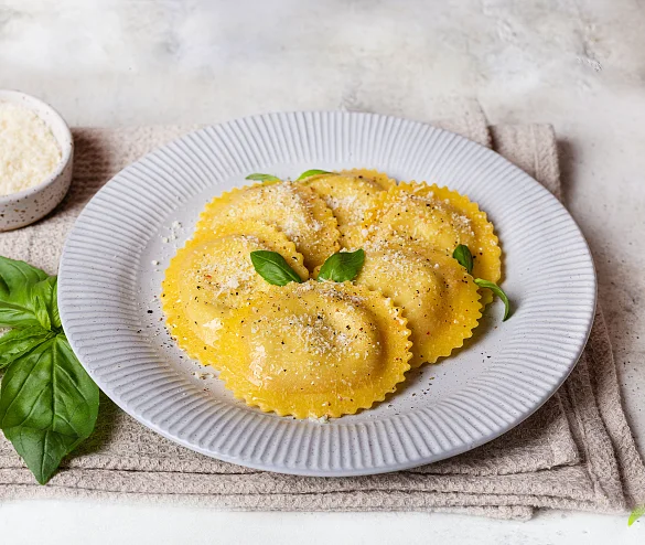 Мука из твердых сортов пшеницы в/с, яйцо куриное пищевое, мука пшеничная в/с, окорок свиной б/к, вода очищенная, сыр Моцарелла для равиоли (творог, вода очищенная, масло сливочное, молочный белок, сухое обезжиренное молоко, регуляторы кислотности: цитрат натрия, лимонная кислота; соль), лук репчатый свежий, говядина б/к, томатная паста, морковь столовая свежая, сыр Пармезан (молоко нормализованное пастеризованное, соль (содержит агент антислеживающий ферроцианид калия), уплотнитель хлорид кальция, молокосвертывающий ферментный препарат животного происхождения, ферментный препарат животного происхождения липаза, консервант нитрат натрия, ферментный препарат лизоцим (белок куриных яиц), бактериальная закваска молочнокислых мезофильных и термофильных микроорганизмов, краситель аннато (содержит регулятор кислотности гидроксид натрия)), масло сливочное (сливки пастеризованные), масло подсолнечное рафинированное дезодорированное, соль, краситель натуральный бета-каротин, перец черный молотый, базилик сушеный. Произведено на предприятии, на котором также выпускаются продукты, содержащие арахис, горчицу, кунжут, моллюски, орехи, рыбу, сельдерей, сою.