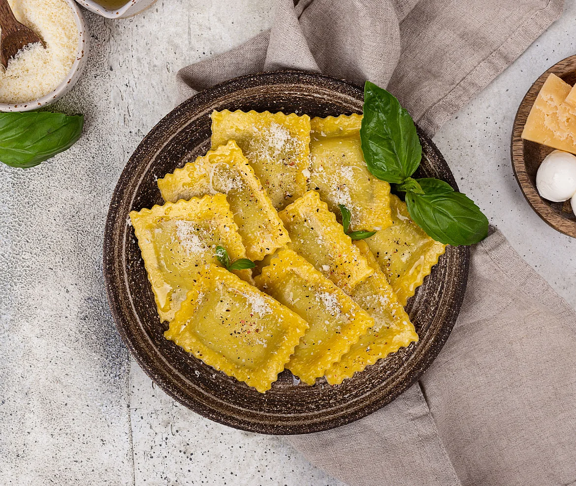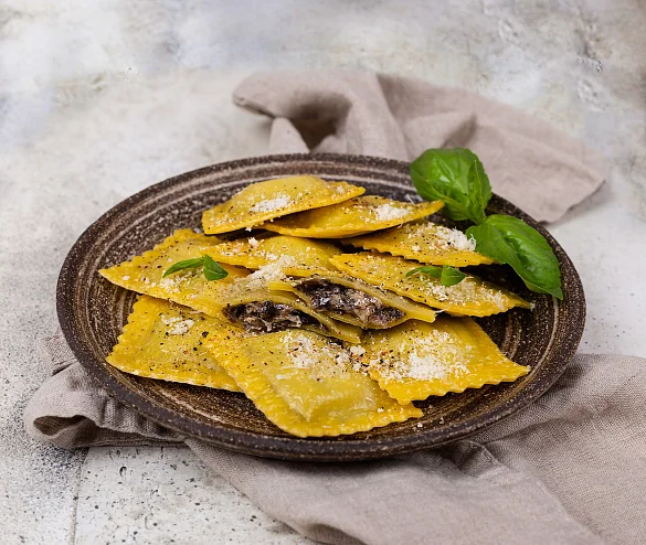 Вкуснейшая свежая паста премиум-качества. Тесто с мукой из твердых сортов пшеницы, привезенной специально из Италии. В тесте только цельные свежие яйца, без порошков. 50% начинки из свежих шампиньонов и настоящего сыра без ЗМЖ - ароматного Пармезана, пикантного Маасдама и молодого рассольного сыра. Готовятся всего 2 минуты - так сохраняются сложные углеводы твердых сортов пшеницы. Полезные медленные углеводы дают ощущение сытости надолго. В упаковке две порции. Идеально с соусом для пасты!
