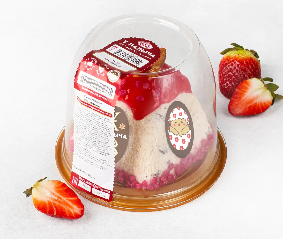 Пасха – уникальная разработка ТМ «У Палыча», шедевр ручной работы! Это именно такая пасха, какой она и должна быть – натуральный творог, качественный ароматный изюм, отборное сливочное масло, сгущенное молоко без заменителей молочных жиров, без искусственных красителей и ароматизаторов. Клубничная пасха: в нежную творожную массу добавлены изюм, фундук и ароматный клубничный джем. В декоре яркий клубничный топпинг, сладкий изюм и миндаль. И традиционно украшена шоколадной медалькой из темного шоколада с праздничным рисунком. Энергетическая ценность (средние значения на 100 г продукта): 349 ккал/1462 кДж