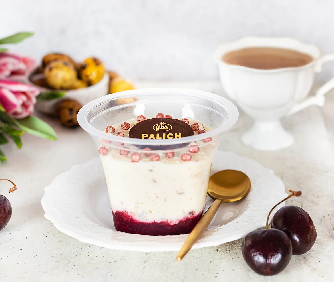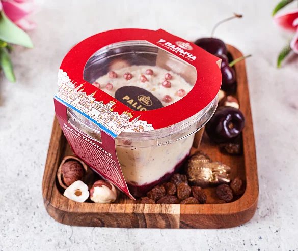Творог 9%-ной жирности (36%) (молоко нормализованное, закваска), начинка вишневая (25%) (вишня с/м, сахар, вода очищенная, загуститель пектины, регулятор кислотности лимонная кислота), молоко цельное сгущенное с сахаром 8,5%-ной жирности (15%) (молоко нормализованное, сахар (сахароза, лактоза)), масло сливочное 82,5%-ной жирности (11%) (сливки пастеризованные), сахар, ядра орехов фундука (3%), яйцо куриное пищевое, виноград сушеный (изюм), шарики рисовые шоколадные (сахар, масло какао, мука рисовая, мука пшеничная в/с, молоко цельное сухое, сыворотка молочная сухая, эмульгатор соевый лецитин, ароматизатор экстракт ванили натуральный, соль, краситель натуральный кармины), шоколад темный (какао тёртое, сахар, масло какао, эмульгатор соевый лецитин, краситель натуральный бета-каротин, ароматизатор экстракт ванили натуральный), ароматизатор экстракт ванили натуральный. ПРИ ПРОИЗВОДСТВЕ ИСПОЛЬЗУЮТСЯ ИЗЮМ, ОРЕХИ И СВЕЖЕМОРОЖЕНЫЕ ЯГОДЫ ВИШНИ, КОТОРЫЕ ПРОШЛИ ТЩАТЕЛЬНУЮ ОБРАБОТКУ, ОДНАКО, В РЕДКИХ СЛУЧАЯХ НЕ ИСКЛЮЧЕНО ПОПАДАНИЕ КОСТОЧЕК, СКОРЛУПЫ И (ИЛИ) ИХ ФРАГМЕНТОВ.