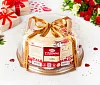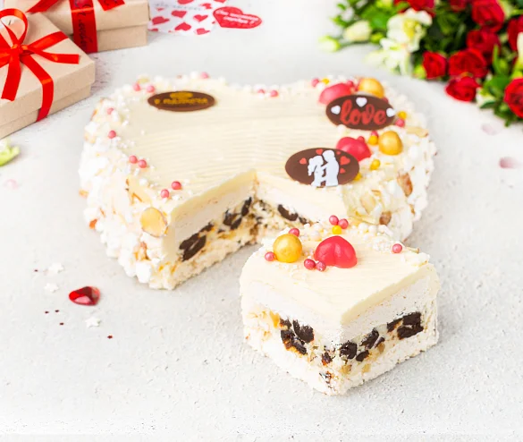 Это изысканное произведение кондитерского искусства ручной работы состоит из двух слоев хрупкого воздушного безе с потрясающе вкусным сливочно-заварным кремом и сливочным мороженым собственного производства, с отборным черносливом и миндалем. Торт украшен милой шоколадной открыткой из лучшего темного шоколада – специально к Дню святого Валентина. ***Поздравительная надпись на торте может отличаться, но обязательно будет праздничной.