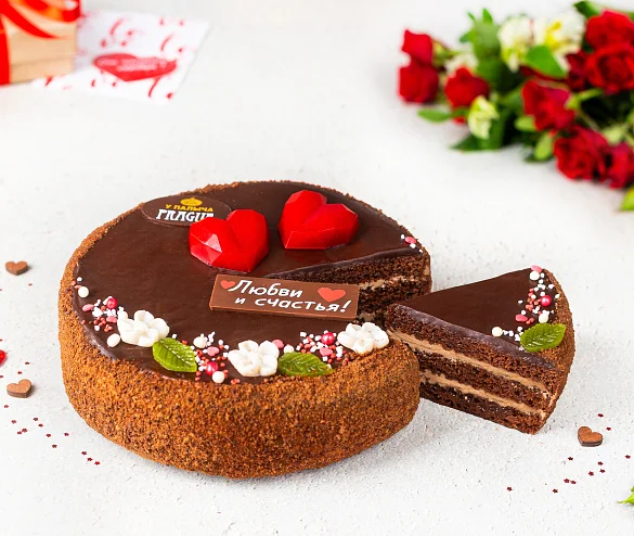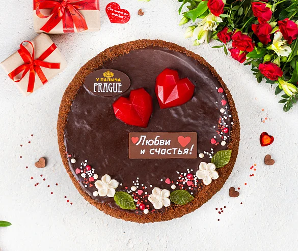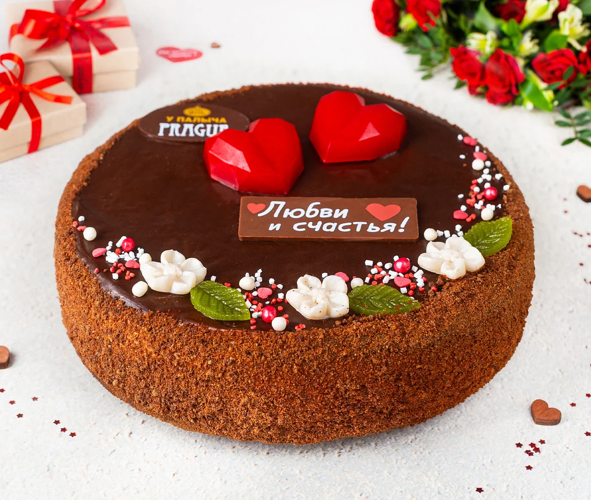 Необыкновенный торт, выпеченный со сметаной и натуральным сгущенным молоком, отборным сливочным маслом и натуральным шоколадом. Три слоя шоколадного бисквита, взбитый нежный сливочно шоколадный крем и темный шоколад - истинное шоколадное наслаждение! Прага от Палыча нежная и ароматная, благодаря ликеру в пропитке коржей, раскрывающему густой шоколадный вкус эквадорского какао. К нежному празднику Дня Святого Валентина торт украшен яркими сердцами из молочного мармелада и шоколадной табличкой с праздничной надписью из элитного темного шоколада без заменителей какао продуктов. ***Поздравительная надпись на торте может отличаться, но обязательно будет праздничной.
