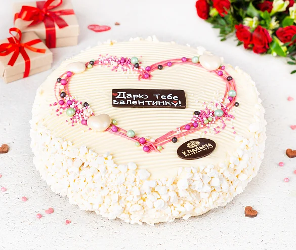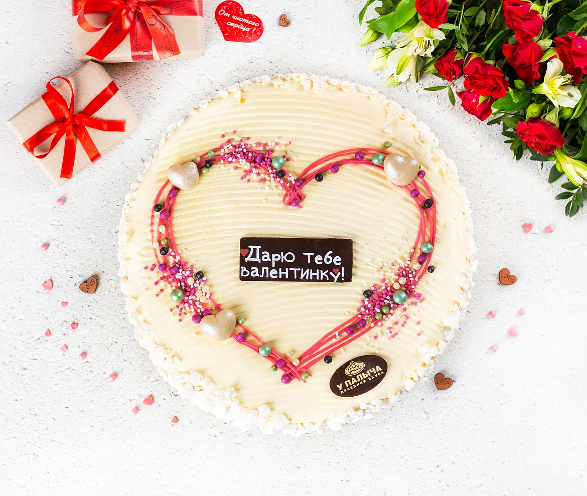Этот изысканный торт ручной работы - воплощение нежности в кондитерском искусстве. Торт состоит из хрупкого воздушного безе с потрясающе вкусным сливочным кремом из отборного сливочного масла и сгущенного молока. Специально к Дню всех влюбленных торт украшен яркой композицией в виде сердца и шоколадной табличкой из лучшего темного шоколада от Палыча. ***Поздравительная надпись на торте может отличаться, но обязательно будет праздничной.