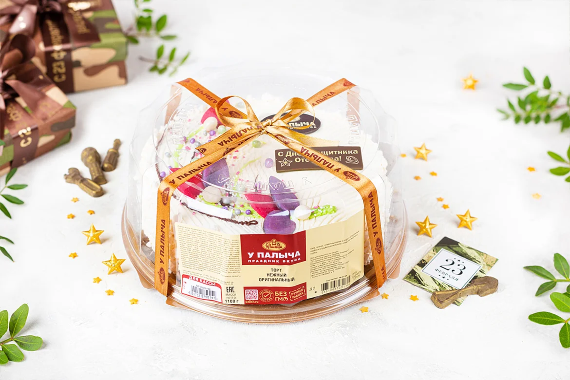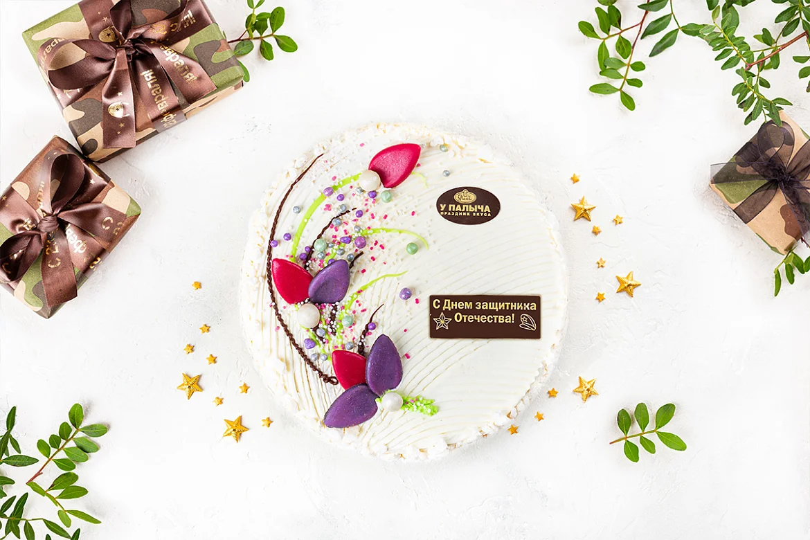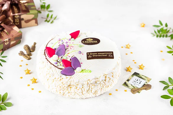 Этот изысканный торт ручной работы - воплощение нежности в кондитерском искусстве. Торт состоит из хрупкого воздушного безе с потрясающе вкусным сливочным кремом из отборного сливочного масла и сгущенного молока. Торт украшен звездами из элитного темного шоколада и рисовыми бусинами, а специально к празднику День Защитника Отечества на торте шоколадная табличка с праздничной надписью из лучшего темного шоколада. ***Поздравительная надпись на торте может отличаться, но обязательно будет праздничной.