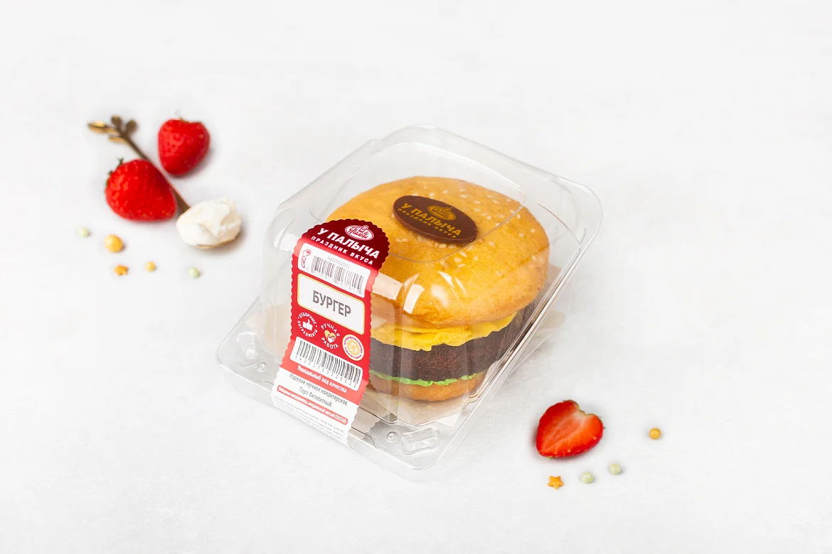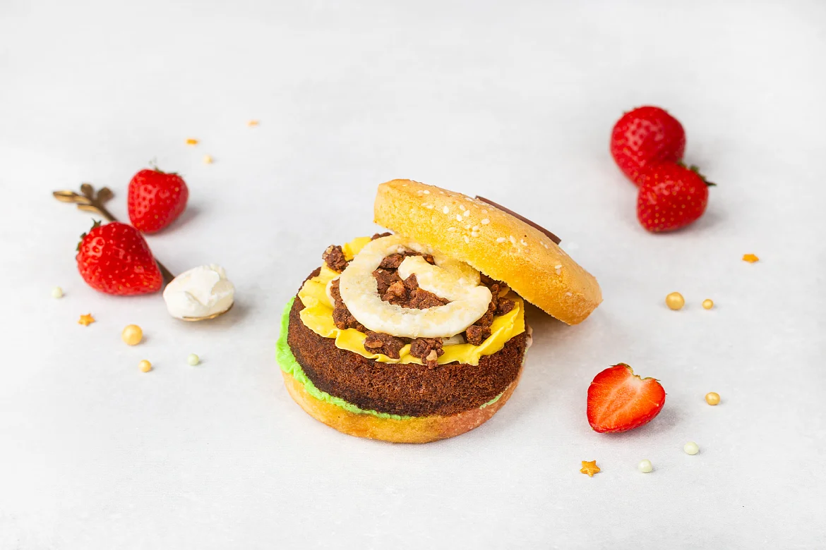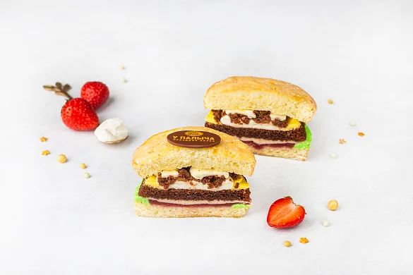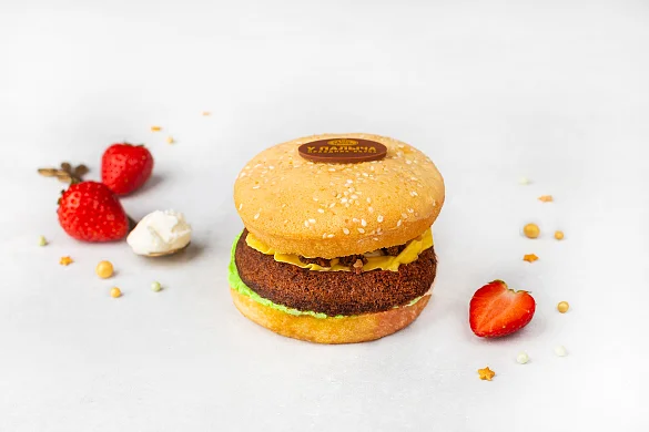 Десерт, который Вас удивит - торт Бургер! Сверху — золотистая «булочка» из воздушного пропитанного бисквита, щедро усыпанная кунжутом. Внутри — сочная «котлета» из шоколадного бисквита с настоящим темным шоколадом. Аппетитный зеленый салат и тающий сыр из сливочного крема с настоящим сгущенным молоком, и яркий "кетчуп" из спелой клубники. А теперь — фишка: нежный ванильно-творожный крем с добавлением настоящего сыра обволакивает каждый кусочек, а хрустящая прослойка из воздушного безе добавляет ощущений. Идеально для дня рождения, детского праздника и просто чтобы удивить гостей или порадовать себя. Энергетическая ценность/ калорийность: 1219 кДж/ 291 ккал.