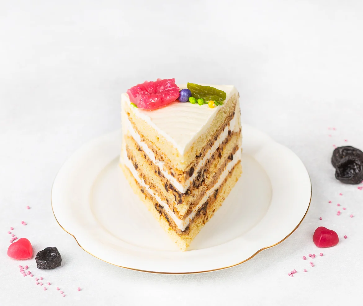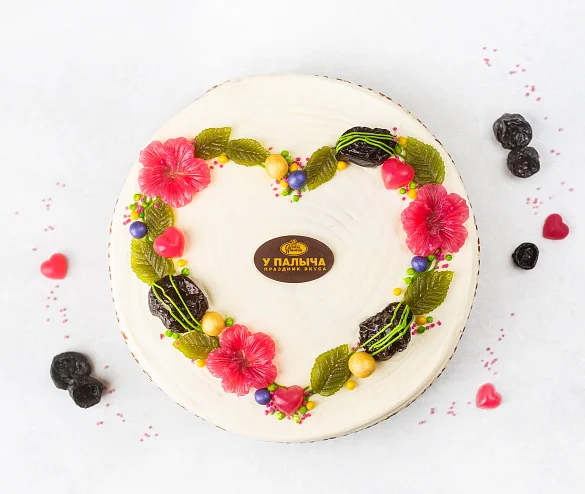 Сочетание трех мягких песочных коржей на сметане, сливочного суфле с натуральным сгущенным молоком без заменителей молочных жиров и сливочно-заварного крема с нежным разваренным черносливом и спелой сливой. Поверхность торта покрыта сливочным кремом и украшена яркой композицией в виде сердца с элитным темным шоколадом, натуральным фруктовым мармеладом, воздушным рисом в белом шоколаде и вкуснейшим черносливом. Боковые стороны оформлены нежным рулетным бисквитом с узнаваемым рисунком.