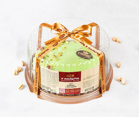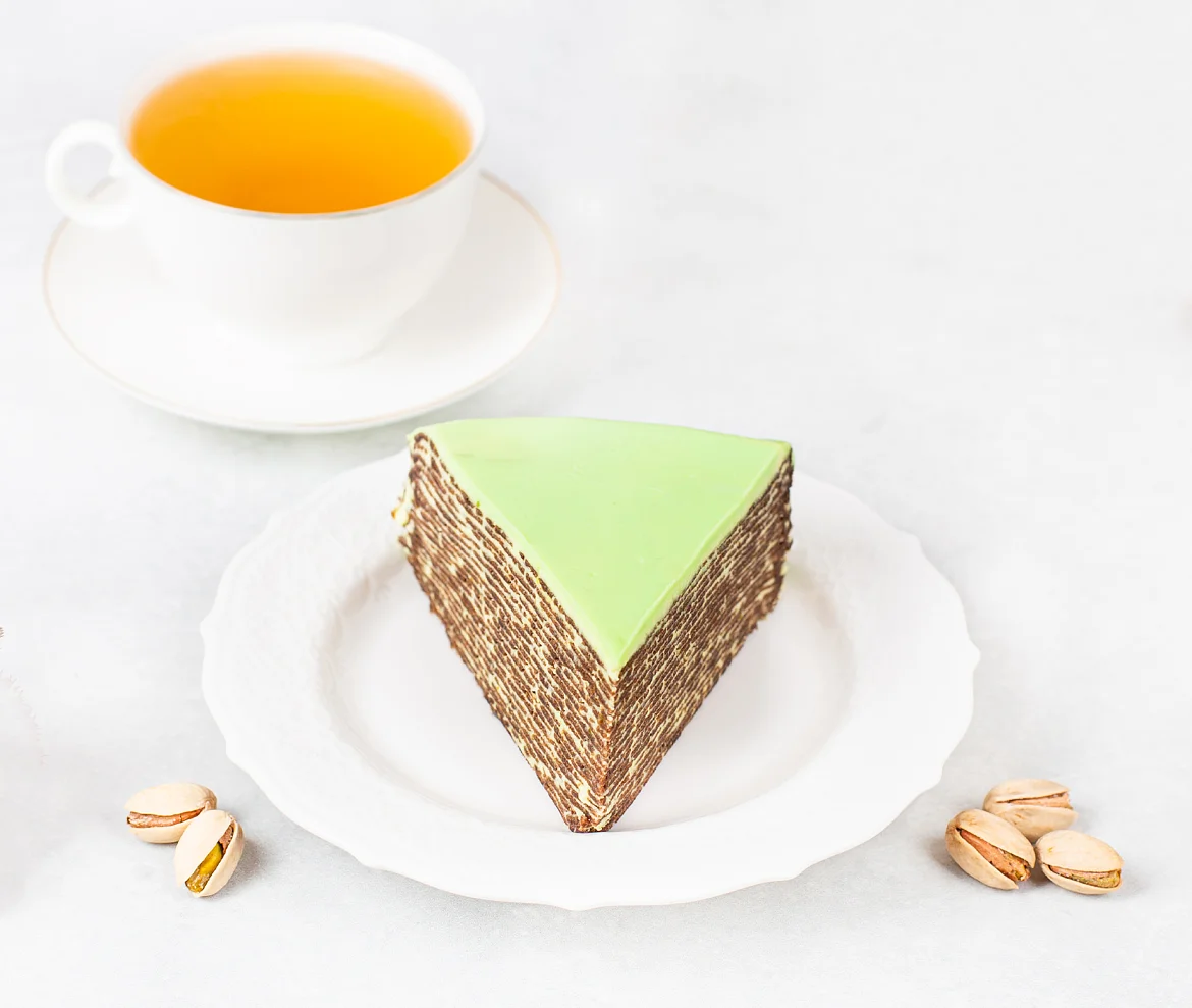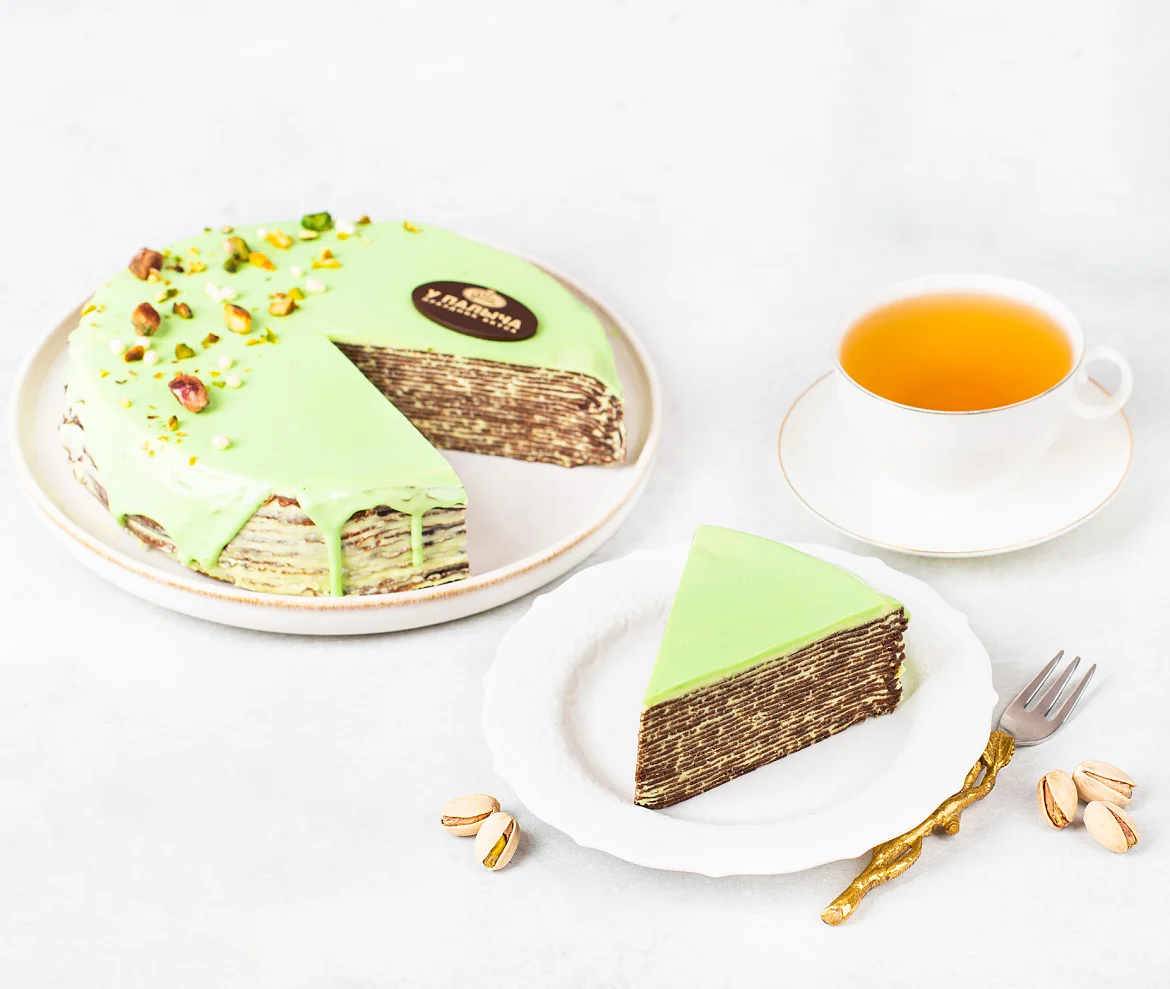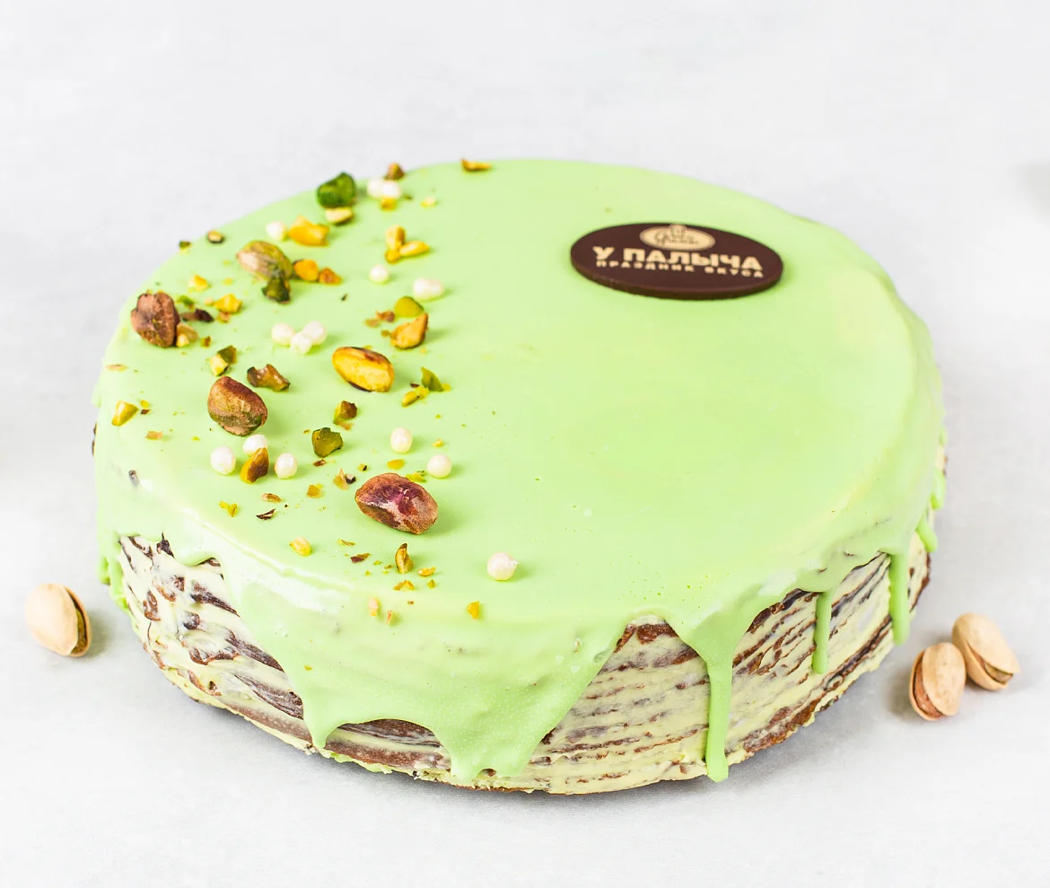 Блинный торт с фисташкой - отличное решение! Тончайшие блинчики по авторскому рецепту шеф-повара на цельном молоке с добавлением премиального эквадорского какао и легкий сливочный крем на основе ореховой пасты из отборных фисташек. Восхитительно нежно и безумно вкусно! Сверху торта ганаш из настоящего белого шоколада и россыпь фисташек с жемчужинами из воздушного риса.