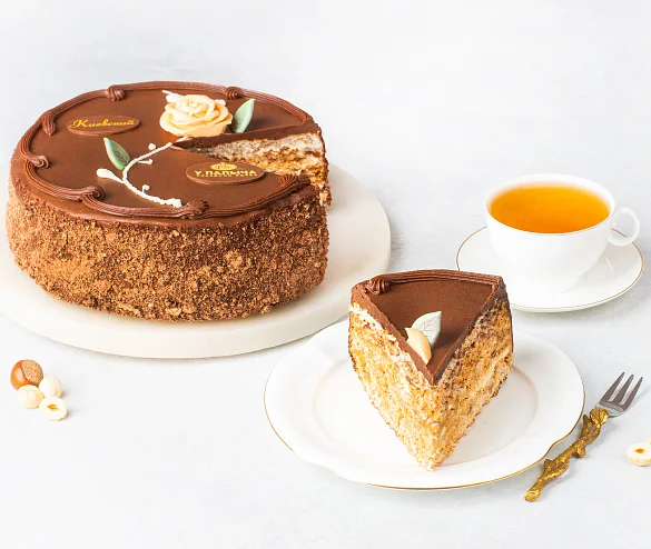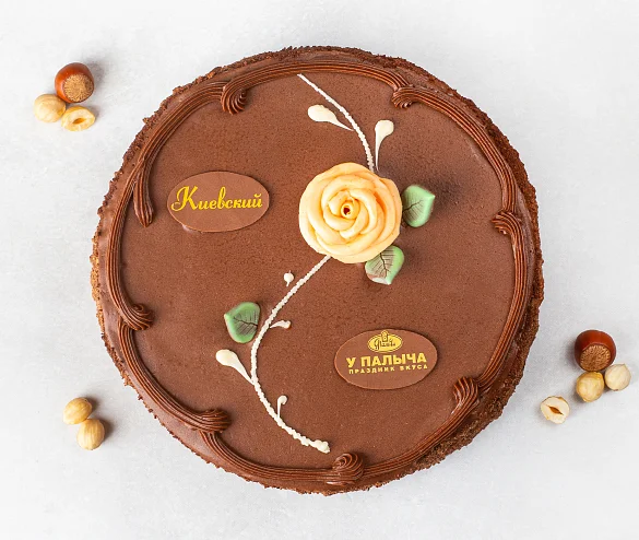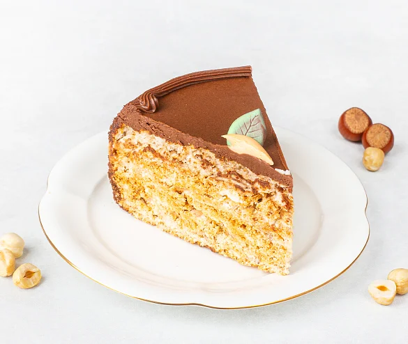 Три слоя воздушно-ореховых коржа из мелкодробленого цельного ореха, яичного белка, сахара и муки. Прослоены сливочно-заварным шоколадным кремом с добавлением коньяка. Торт покрыт сливочно-заварным шоколадным кремом, украшен веточкой с розой из сливочного крема, боковые стороны украшены шоколадной крошкой.