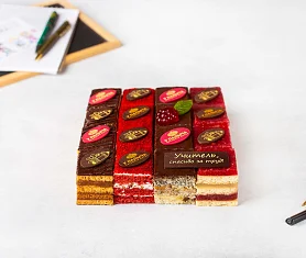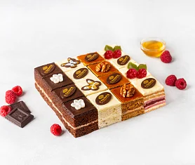 Сахар, масло сливочное (сливки пастеризованные), яйцо куриное пищевое, вода очищенная, слива сушеная (чернослив), мороженое сливочное (молоко питьевое, сливки питьевые с массовой долей жира 33%, сахар, масло сливочное, сухое обезжиренное молоко, декстроза, инулин, сухой глюкозный сироп, стабилизаторы: моно- и диглицериды жирных кислот, камедь рожкового дерева, гуаровая камедь, каррагинан; сухая молочная сыворотка, мальтодекстрин, ароматизатор), финики, ядра орехов фундука, молоко питьевое, шоколад темный (какао тёртое, сахар, масло какао, эмульгатор соевый лецитин, ароматизатор), мука рисовая, желирующий агент желатин, патока, глюкоза ферментированная, шоколад белый (сахар, масло какао, молоко цельное сухое, сыворотка молочная сухая, эмульгатор соевый лецитин, ароматизатор экстракт ванили натуральный), белок яичный сухой, какао-порошок, ядра миндаля, рисовые шарики (крупа кукурузная, мука рисовая, сахар, вода, стабилизатор карбонат кальция, соль), инулин, ароматизаторы, красители: бета-каротин, медные комплексы хлорофиллов, куркумин, оксиды и гидроксиды железа. Произведено на предприятии, на котором также выпускаются продукты, содержащие арахис, кунжут. ПРИ ПРОИЗВОДСТВЕ ИСПОЛЬЗУЮТСЯ ЧЕРНОСЛИВ И ОРЕХИ, КОТОРЫЕ ПРОШЛИ ТЩАТЕЛЬНУЮ ОБРАБОТКУ, ОДНАКО, В РЕДКИХ СЛУЧАЯХ НЕ ИСКЛЮЧЕНО ПОПАДАНИЕ КОСТОЧЕК, СКОРЛУПЫ И (ИЛИ) ИХ ФРАГМЕНТОВ.