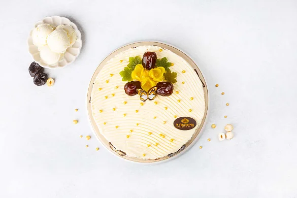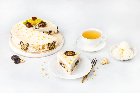 Торт состоит из двух слоев воздушного безе, промазанных сливочно-заварным кремом с добавлением сливочного мороженого, кусочков разваренного чернослива, измельченного фундука и грецкого ореха. Торт покрыт нежным сливочно-заварным кремом с мороженым. Боковая поверхность украшена крошкой воздушного безе и миндальными лепестками. В обновленном декоре торта украшение композицией из хрустящего воздушного риса и цветов из натурального фруктового мармелада.