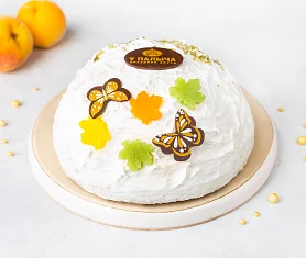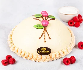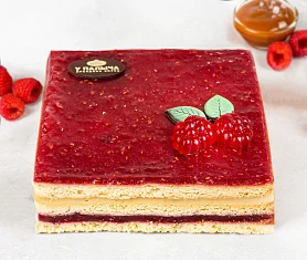 Сочетание тончайших слоеных коржей и рулетного бисквита, каждый слой промазан сливочно-заварным кремом с "итальянской" меренгой. Божественная начинка из лесной малины собственного производства. Торт украшен лепестками миндаля, малинками и листиками из фруктового мармелада.