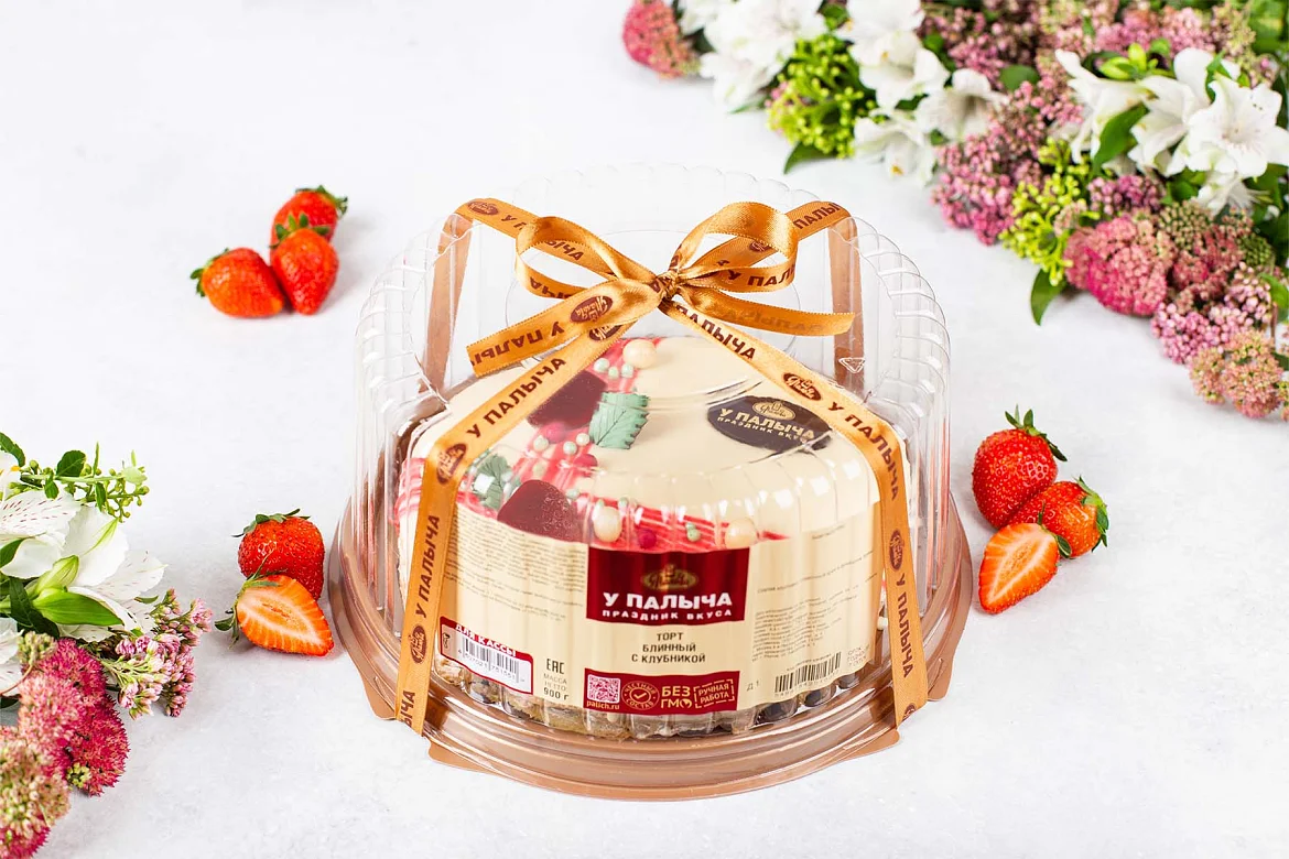 Торт приготовлен из классических блинчиков, выпеченных по нашему собственному рецепту без дрожжей на цельном молоке. Каждый блинчик прослаивают невероятно вкусным сливочным кремом с добавлением начинки из спелой клубники, для яркого вкуса - прослойка из ароматного клубничного варенья собственного производства. Сверху торта вкуснейший ганаш из настоящего белого шоколада. Торт украшен клубничками и листиками из натурального фруктового мармелада.