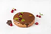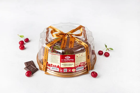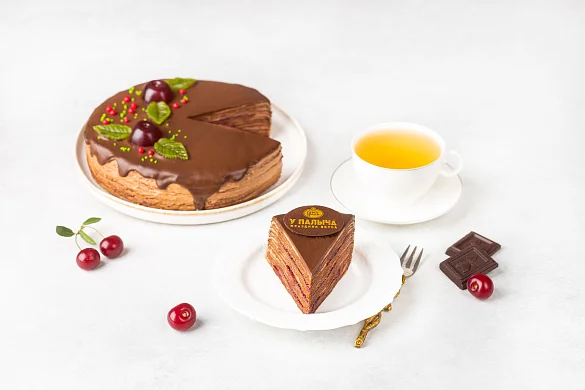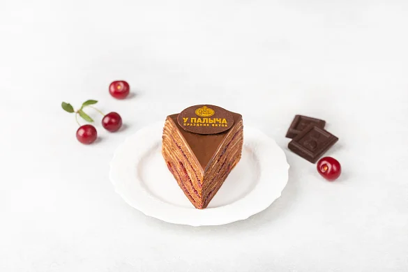 Торт состоит из настоящих блинов с премиальным эквадорским какао, испеченных по авторскому рецепту нашего бренд-шефа. Блинчики прослоены нежным сливочно-шоколадным кремом и двумя слоями ароматной начинки из сладкой сербской вишни собственного изготовления. Сверху торта вкуснейший ганаш с настоящим темным шоколадом. Торт украшен вишенками и листиками из натурального фруктового мармелада.