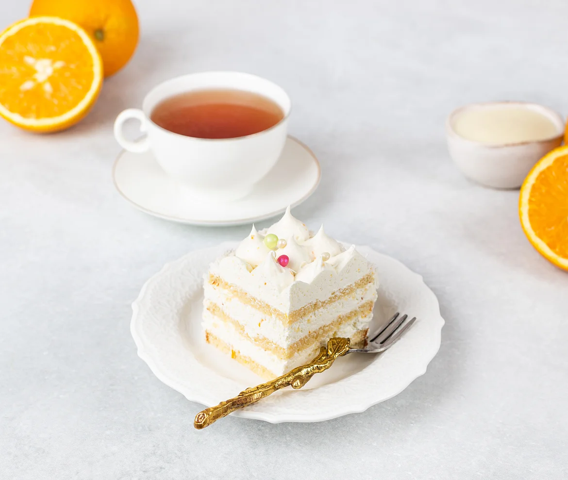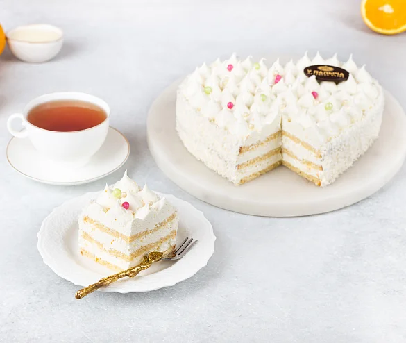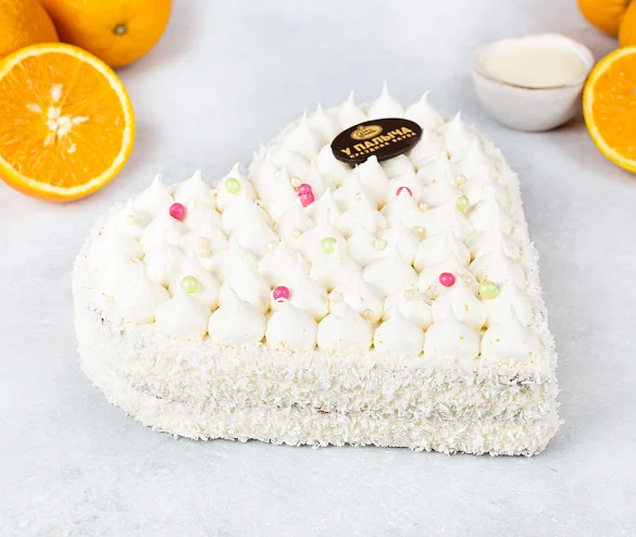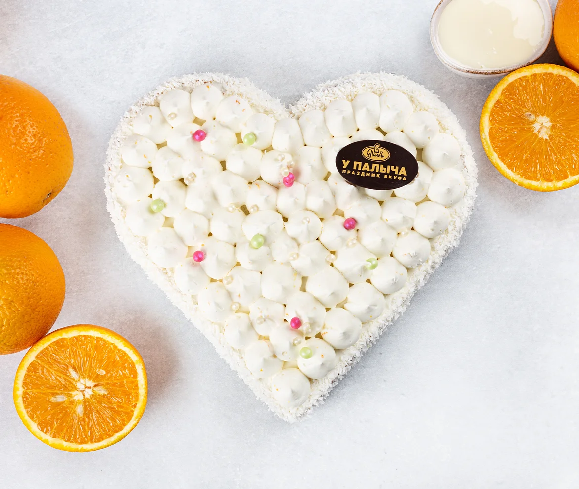 Пышный бисквит на сгущенном молоке без заменителей молочных жиров, пропитанный молочным сиропом с пониженным содержанием сахара, воздушный крем с настоящей сгущенкой, свежевыжатым апельсиновым соком и апельсиновой цедрой. Роскошный торт в форме сердца украшен жемчужинами из воздушного риса и сливочными пиками из крема. Трендовый торт в оригинальном прочтении от шеф-кондитера У Палыча.