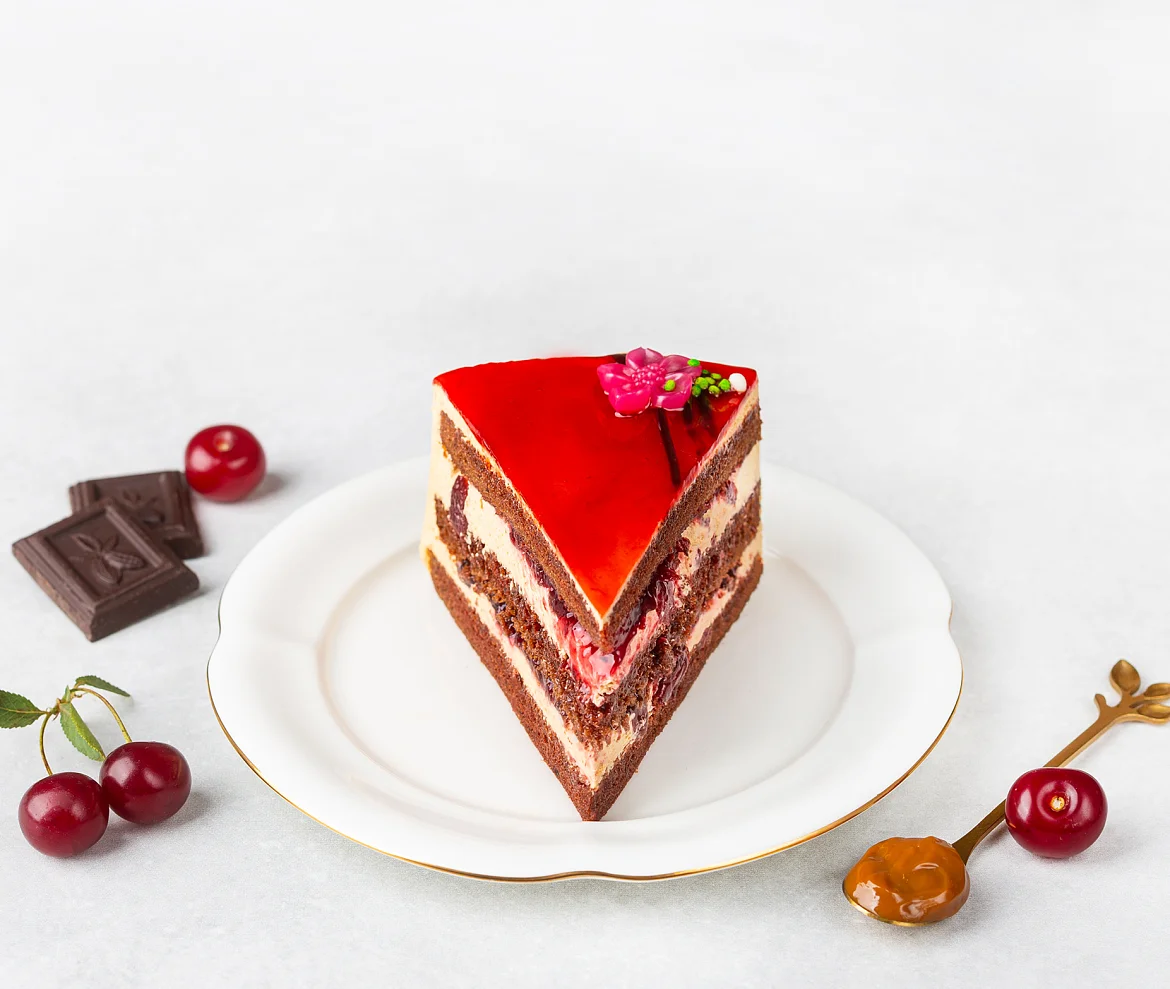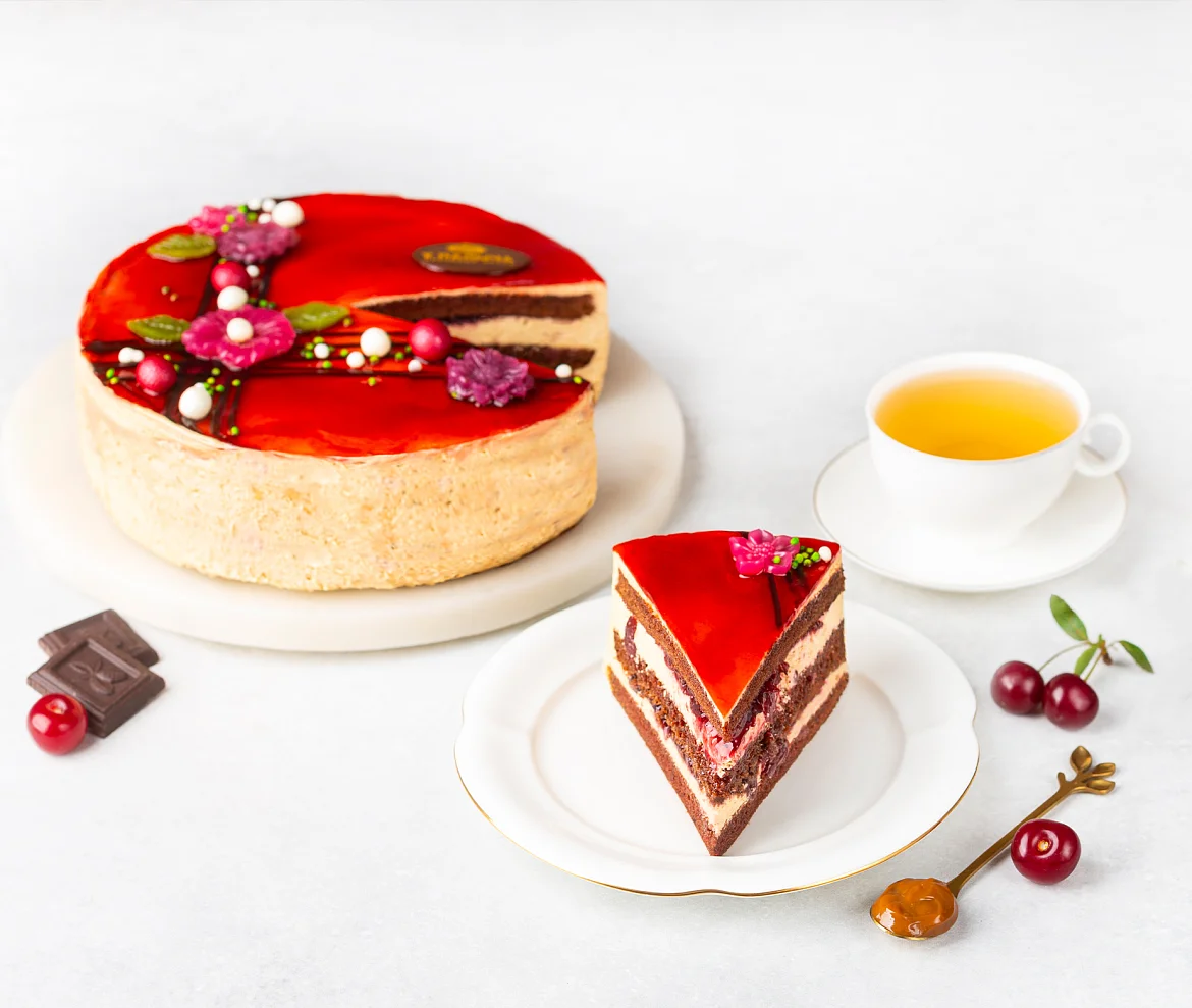 Мягкие шоколадные коржи со сметаной и натуральным сгущенным молоком, воздушный крем с вареной сгущенкой без заменителей молочных жиров и много-много вишневой начинки из сладкой сербской вишни.