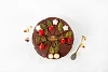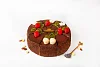 Изумительный торт из трех видов белого бисквита – с маком, с арахисом и изюмом. Бисквит пропитан сахарным сиропом с добавлением ликера, каждый слой промазан сливочным кремом. Торт порционный, боковые стороны украшены шоколадной крошкой, поверхность залита шоколадной помадкой и украшена ягодками из фруктового мармелада и листиками из темного шоколада.