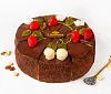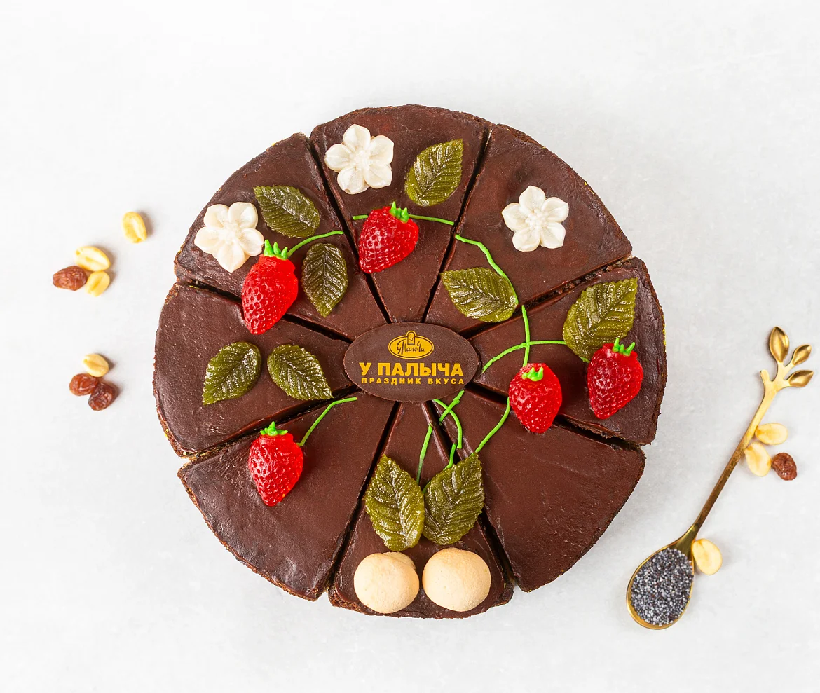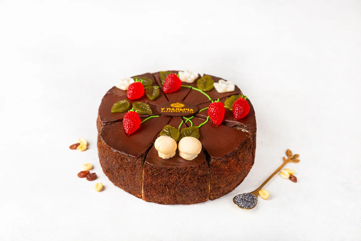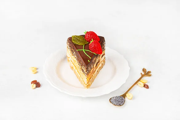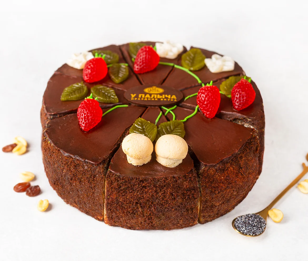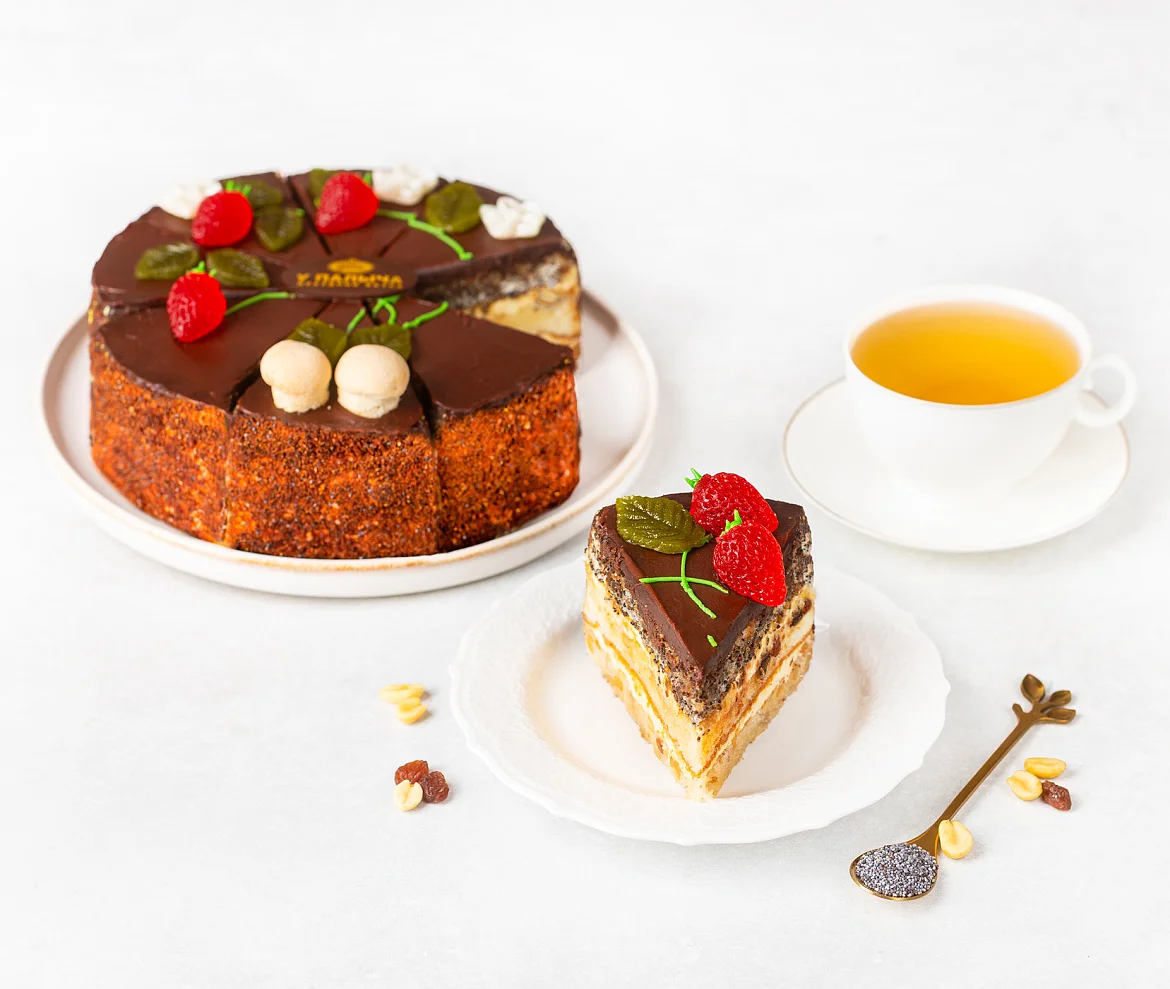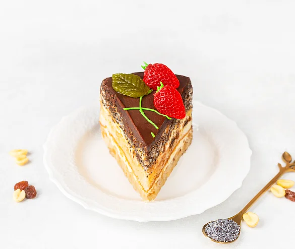 Изумительный торт из трех видов белого бисквита – с маком, с арахисом и изюмом. Бисквит пропитан сахарным сиропом с добавлением ликера, каждый слой промазан сливочным кремом. Торт порционный, боковые стороны украшены шоколадной крошкой, поверхность залита шоколадной помадкой и украшена ягодками из фруктового мармелада и листиками из темного шоколада.