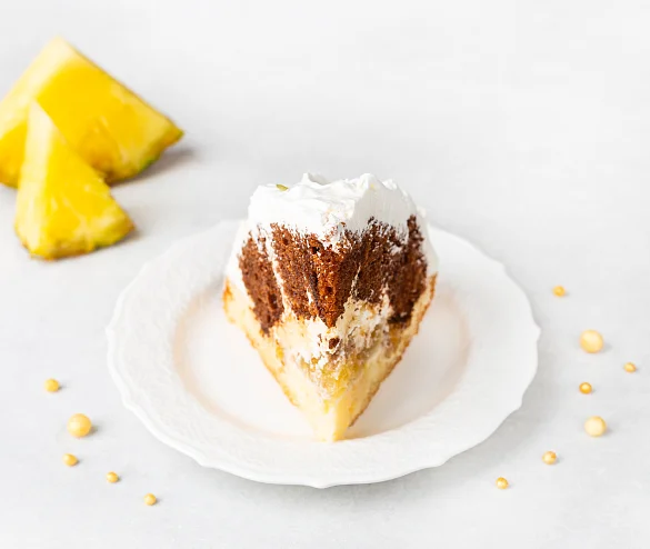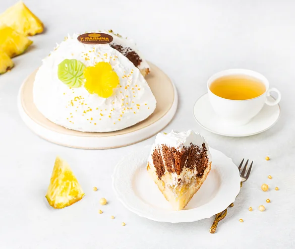 Великолепное сочетание белого и шоколадного бисквита, крема из натуральной сметаны и взбитых сливок, изобилие начинки из ананаса и отборного грецкого ореха. Торт в виде полусферы, украшен композицией ручной работы из шоколада собственного производства и семенами тыквы.