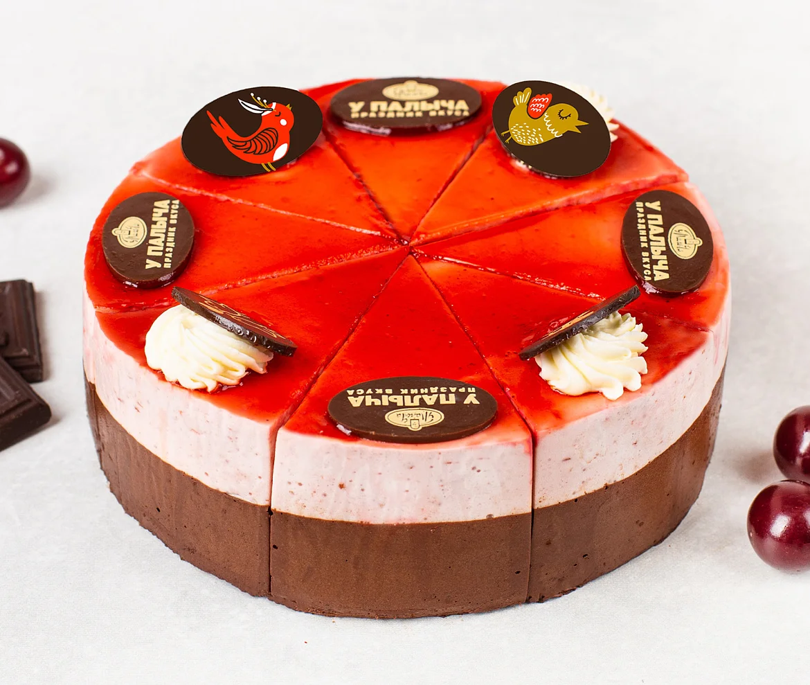 Нежный шедевр от Палыча из суфле со свежими яичными белками и настоящим сгущенным молоком собственного производства без заменителей молочных жиров. Изысканный дуэт вишневого суфле с натуральной вишней и шоколадного суфле с благородным ароматом эквадорского какао в сочетании с мягкими песочными коржами на свежей сметане с настоящим сливочным маслом. Вишневый джем, приготовленный по технологии супербыстрой варки для сохранения природного вкуса вишни, усиливает яркий ягодный вкус. В качестве украшения фирменные медальки из настоящего темного шоколада.