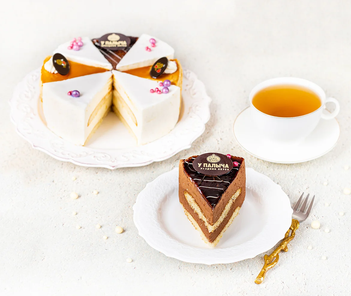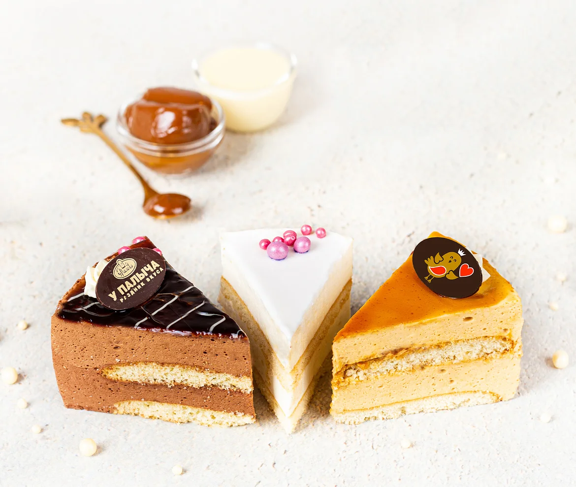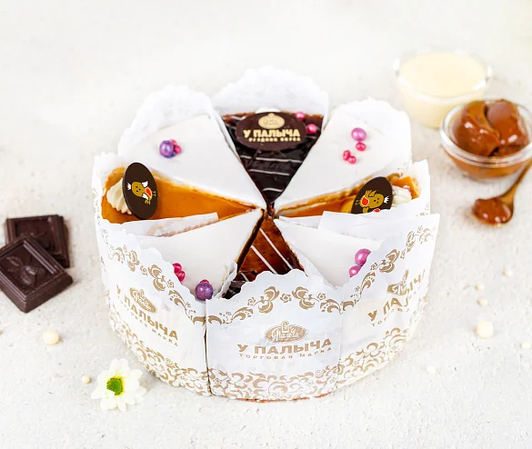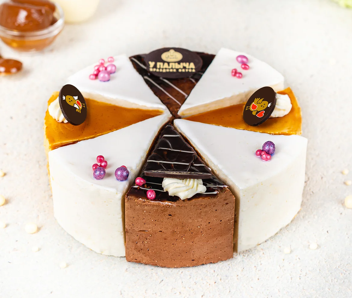 Торт состоит из трех видов тортов "Птичка– классика 4 кусочка, крем-брюле 2 кусочка, шоколадная 2 кусочка".