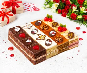 Молоко сгущенное с сахаром вареное (39%) (сахар (сахароза, лактоза), молоко сухое обезжиренное, вода, масло сливочное), сахар, яйцо куриное пищевое, масло сливочное (15%) (сливки пастеризованные), мука пшеничная в/с, вода очищенная, ядра арахиса, сметана (сливки, закваска), крахмал картофельный, шоколад темный (какао тёртое, сахар, масло какао, эмульгатор соевый лецитин, ароматизатор экстракт ванили натуральный), ядра миндаля, ядра орехов фундука, какао-порошок, уксус столовый, красители: сахарный колер I простой, бета-каротин, оксиды железа; разрыхлитель сода пищевая (гидрокарбонат натрия), желирующие агенты: агар, пектины; патока, регулятор кислотности лимонная кислота, ароматизатор экстракт ванили натуральный, глюкоза ферментированная. Произведено на предприятии, на котором также выпускаются продукты, содержащие кунжут. ПРИ ПРОИЗВОДСТВЕ ИСПОЛЬЗУЮТСЯ ОРЕХИ, КОТОРЫЕ ПРОШЛИ ТЩАТЕЛЬНУЮ ОБРАБОТКУ, ОДНАКО, В РЕДКИХ СЛУЧАЯХ НЕ ИСКЛЮЧЕНО ПОПАДАНИЕ СКОРЛУПЫ И (ИЛИ) ЕЁ ФРАГМЕНТОВ.
