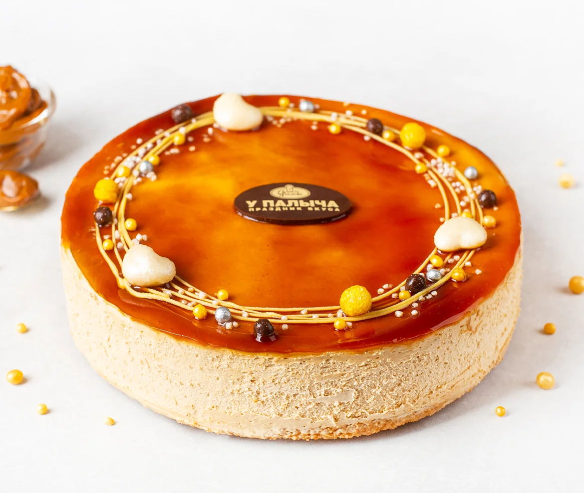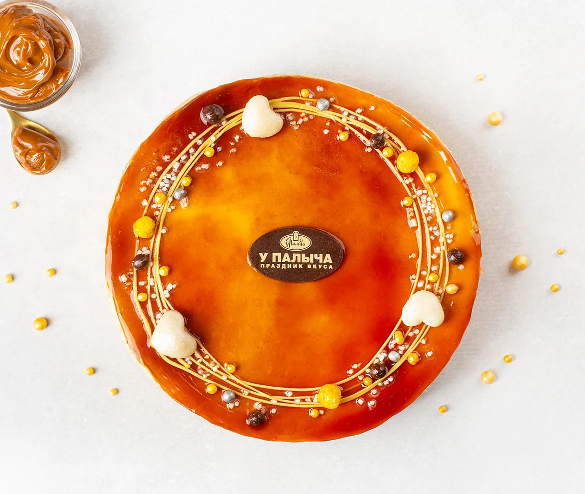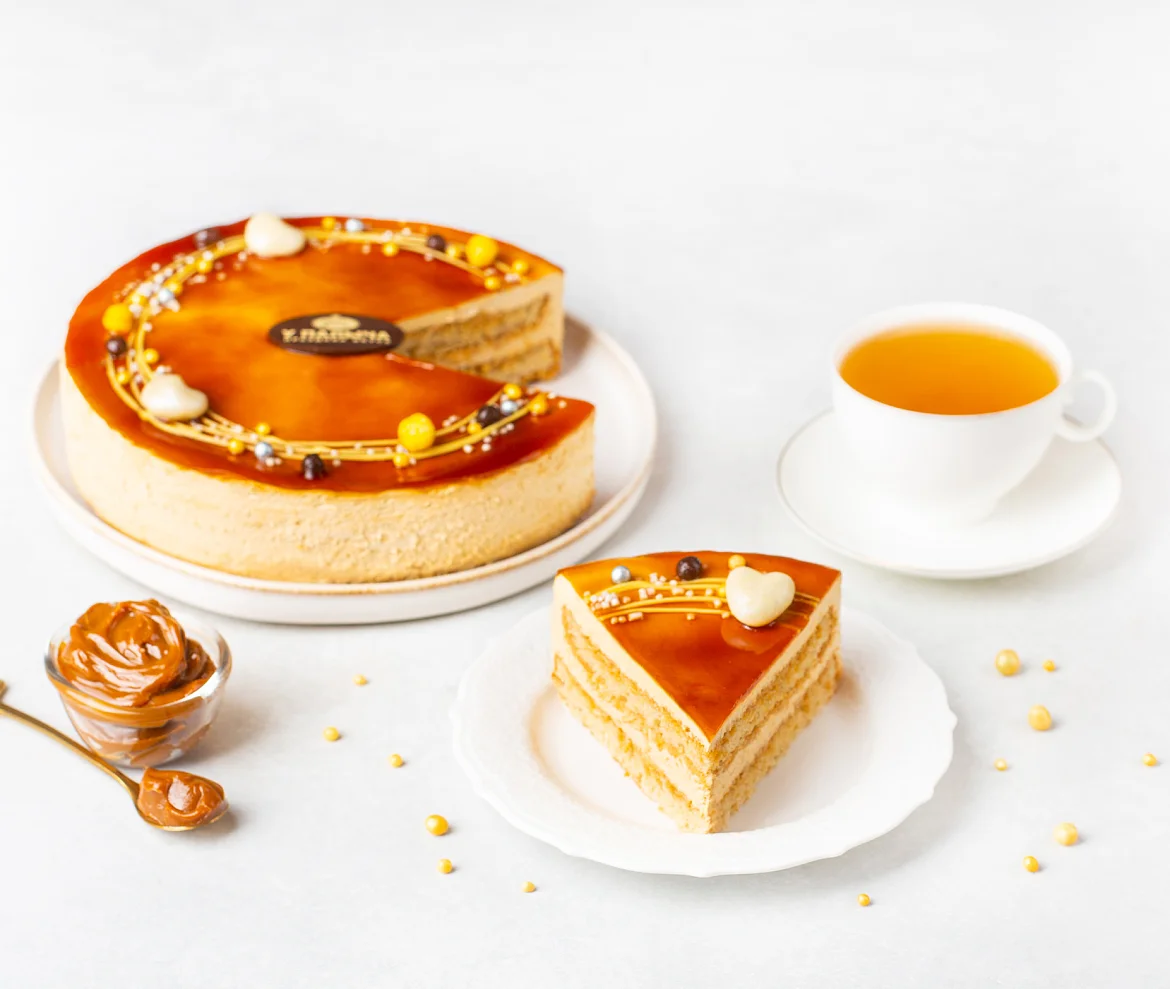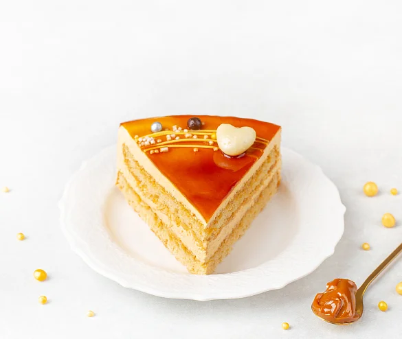 Превосходное сочетание карамельного бисквита пропитанного варёным сгущенным молоком и легкого крема на основе взбитых сливок с варёной сгущёнкои. Торт украшен элитным темным шоколадом и разноцветными рисовыми бусинками.