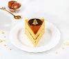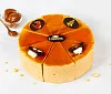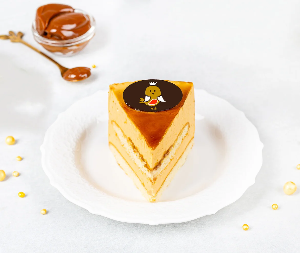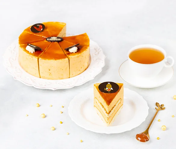 Воздушное сливочное суфле на агаре с добавлением натурального вареного сгущенного молока без заменителей молочных жиров, два нежных песочно-сдобных коржа на сметане со сливочным маслом. Торт порционный украшен сливочным кремом и медальками из элитного темного шоколада.